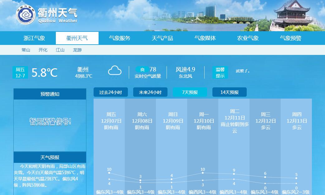 | 网站简介: 衢州市气象局(原衢州气象站)建于1955年10月,位于衢县北门外郊外,为国家基本气象观测站和全球高空探测交换站。衢州市气象局内设办公室、业务科技处、计划财务处和人事教育处四个职能处室,下设气象台、气象网络中心、气象信息中心(原专业气象台)和防雷中心四个直属单位,下属包括衢州气象观测站(2000年1月由现址迁至柯城区浮石街道徐家坞村排门山)、江山市气象局、常山县气象局、开化县气象局和龙游县气象局五个单位。全市核定正式编制101人,实有90人。其主要业务:目前开展的主要业务为地面观测、高空探测、预报服务、气候评价、人工影响天气、防雷安全管理、施放低空飘浮物管理等。 |