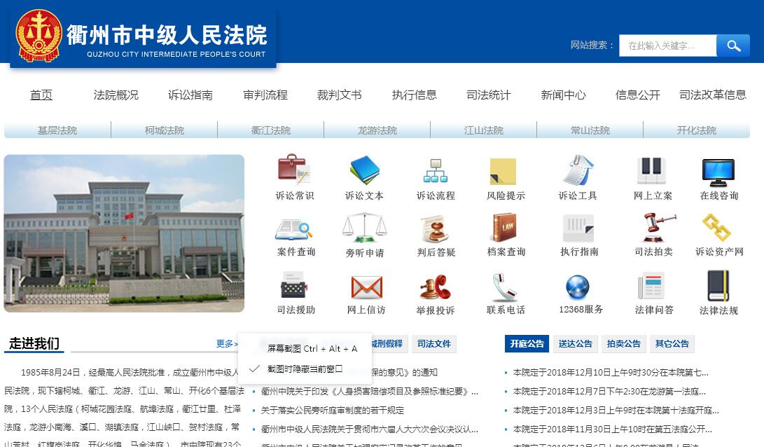 1985年8月24日,经最高人民法院批准,成立衢州市中级人民法院,现下辖柯城、衢江、龙游、江山、常山、开化6个基层法院,12个人民法庭(柯城花园法庭,衢江廿里、杜泽法庭,龙游小南海、溪口、湖镇法庭,江山峡口、贺村法庭,常山芳村、红旗岗法庭,开化华埠、马金法庭),市中院现有23个内设部门,分别是:刑一庭、刑二庭、减刑假释庭、民一庭、民二庭、民三庭、行政庭、执行庭、执行裁决庭、执行综合处、立案一庭、立案二庭、审监庭、办公室、研究室、监察室、宣教处、人事处、司法鉴定处、法警支队、行装处、审判管理处、审判保障中心。全市法院现有在编政法干警612人,其中市中院现有在编政法干警117人。全市法院现有大学本科以上学历531人,占干警总数的86.76%,硕士研究生学位72人,其中市中院具有硕士研究生学历53人,占市中院在职干警总数的45.29%。近年来,全市法院紧紧围绕经济社会发展大局,认真履行审判职能,全力化解社会矛盾,积极参与社会管理,努力推进公正司法,大力加强队伍建设,各项工作均取得新进展。市中院先后荣获党风廉政建设责任制优秀单位、“平安衢州”建设先进集体、阳光司法优秀法院、学习型党组织等荣誉称号。衢江区法院、常山法院、江山法院先后被评为全省优秀法院。市中院吴超英获得“全国五一劳动奖章”、被评为“全国法院办案标兵”,常山法院曹宏被评为全国优秀法官,衢江区法院魏胜杰被评为全国法院先进个人,开化法院汪秋喜被评为全国法院党建工作先进个人。
