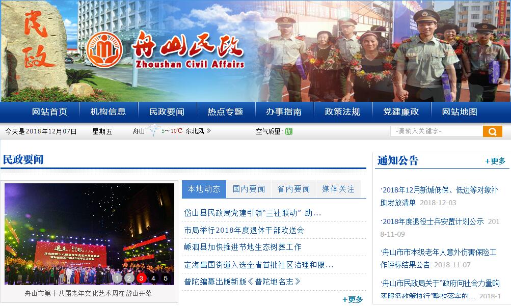 舟山市民政局是主管新区(市)有关社会行政事务的市政府工作部门。其主要职责:(一)贯彻执行国家有关民政工作的法律、法规、规章;拟订新区(全市)民政事业的发展规划和政策,制定工作计划并组织实施;指导基层民政工作。(二)会同有关部门拟订新区(全市)社会工作发展规划、工作计划和政策,推进新区(全市)社会工作人才队伍建设,推动新区(全市)社会工作发展。(三)负责新区(全市)社会组织管理,负责市本级社会团体、民办非企业单位和非公募基金的登记、监督管理和执法监察工作。(四)负责新区(全市)拥军优属、优待抚恤和烈士褒扬工作,承办烈士称号和伤残等级评定申报工作。(五)负责退役士兵、军队(含武警)离退休干部、军队无军籍离休干部和退休退职职工的接收安置和服务管理工作。(六)负责新区(全市)救灾减灾工作,组织核查、报送和发布灾情;监督管理救灾款物分配使用;牵头制定自然灾害应急预案,并组织实施;指导避灾安置场所和救灾物资储备库的建设和管理;组织、指导开展救灾捐赠工作,承担救灾捐赠款物的接收和分配;指导新区(全市)政策性农村住房保险倒塌房屋争议裁定工作。(七)拟订新区(全市)社会救助规划、政策和标准,协调各部门开展社会救助工作,健全城乡社会救助体系;指导和监督新区(全市)实施城乡居民最低生活保障、医疗救助、临时救助和生活无着人员救助工作;负责申请救助家庭经济状况核对工作。(八)拟订新区(全市)社会福利事业发展规划、政策和标准;依法管理、指导慈善事业;指导和参与老年人、孤儿、困境儿童等特殊困难群体的权益保障工作;组织、指导养老服务体系建设,负责新区(市)养老机构设立的审批工作;负责农村五保、城镇“三无”对象的供养工作;负责农村老党员、老交通员、老游击队员的生活困难定期补助工作。(九)负责承办涉外、涉港澳台、华侨婚姻登记和儿童收养登记;负责殡葬管理工作。(十)负责指导城乡基层政权建设和基层群众自治组织建设工作;指导社区服务管理和村务公开、民主管理工作,推进城乡社区建设。(十一)负责民政事业规划和业务统计工作,指导、监督民政事业费的使用管理。(十二)负责行政区划和地名管理;规范新区(全市)地名标志的设置和管理;负责行政区域界线的勘定和日常管理工作,调查和调处行政区域边界争议。(十三)会同有关部门制定社会福利企业的扶持保护政策并监督落实;保障残疾职工的合法权益;承办新区(全市)社会福利企业的审批。(十四)负责新区(全市)福利彩票发行和福彩公益金的管理工作。(十五)负责管理、指导新区(全市)大中型水库移民后期扶持和小型水库移民解困工作。(十六)承办新区党工委、管委会和市委、市政府交办的其他事项。
