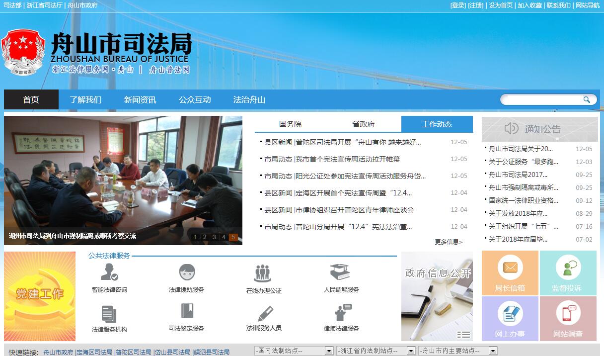 舟山市司法局主要职责:(一)贯彻执行国家司法行政工作方针、政策和法律、法规、规章,起草新区(全市)司法行政工作的规范性文件;编制司法行政发展规划、年度计划并组织实施。(二)负责新区(全市)司法行政系统强制隔离戒毒工作并承担相应责任。(三)指导管理新区(全市)社区矫正、帮教安置工作。(四)拟订新区(全市)法制宣传与普法教育的规划并组织实施;指导各县(区)、各部门、各行业法制宣传、依法治理和对外法制宣传工作。(五)指导监督新区(全市)律师、基层法律服务、公证工作;综合管理社会法律服务机构和在新区(全市)设立的国外(境外)律师机构;监督管理新区(全市)面向社会服务的司法鉴定机构及鉴定执业活动;组织实施新区(全市)国家司法考试工作。(六)指导管理新区(全市)司法所建设和人民调解工作;参与社会管理综合治理工作。(七)监督管理新区(全市)法律援助工作;管理、指导、协调新区(全市)“12348”法律服务热线工作;指导监督新区(全市)司法行政法律服务中心工作。(八)指导监督新区(全市)司法行政系统依法行政工作。(九)指导新区(全市)司法行政系统队伍建设、组织建设和思想政治工作;协助县(区)管理司法行政机关领导班子;配合做好法律服务人员等专业技术职务的评审工作;负责新区(全市)司法行政系统的警务管理和警务监督工作。(十)负责局直属单位的内部审计工作;指导新区(全市)司法行政系统的内部审计工作。(十一)指导协调管理新区(全市)司法行政系统的信息化建设;指导管理新区(全市)司法行政系统外事工作;开展政府和民间的法律交流与合作。(十二)指导管理新区(全市)司法行政系统枪支、弹药、服装、车辆、通讯器材等物资装备工作。(十三)指导市律师协会、市公证协会、市人民调解员协会工作。(十四)承办新区党工委、管委会和市委、市政府交办的其他事项。