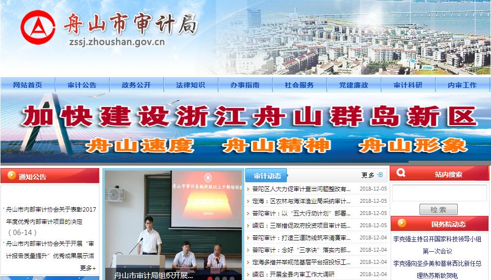 舟山市审计局组建于1984年9月。下辖定海、普陀、岱山、嵊泗4个县(区)审计局,内设办公室、组织人事处、法规处(审计整改督查处)、财政金融审计处、经贸企业审计处、固定资产投资审计处、行政事业审计处、经济责任审计处、直属审计分局、计算机审计中心和政府投资项目审计中心。2017年12月末,全市审计机关行政(事业)总编制人数119名,其中:行政编制人员83名,事业编制人员36名。根据《中共浙江省委办公厅、浙江省人民政府办公厅印发〈关于创新浙江舟山群岛新区行政体制的意见〉的通知》(浙委办发〔2013〕57号),设立舟山市审计局。市审计局是主管新区(市)审计工作的市政府工作部门,其主要职责:(一)负责对市级财政收支和法律法规规定属于审计监督范围的财务收支的真实、合法和效益进行审计监督。对审计、专项审计调查和核查社会审计机构相关审计报告的结果承担责任,督促被审计单位整改。(二)起草有关审计行政管理的规范性文件草案,经批准后组织实施。拟订并组织实施新区(全市)审计工作发展规划和专业领域审计工作规划,制定并组织实施年度审计计划。参与起草财政经济及其相关的规范性文件草案。对直接审计、调查和核查的事项依法进行审计评价,做出审计决定或提出审计建议。(三)负责向市政府和省审计厅提出年度市级预算执行和其他财政收支情况的审计结果报告。受市政府委托向市人大常委会提出市级预算执行和其他财政收支情况的审计工作报告、审计发现问题的纠正和处理结果报告。向市政府报告对其他事项的审计和专项审计调查情况及结果。依法向社会公布审计结果。向市政府有关部门和县(区)人民政府通报审计情况和审计结果。(四)负责直接审计下列事项,出具审计报告,在法定职权范围内做出审计决定或向有关主管机关提出处理处罚的建议:1.市级预算执行情况和其他财政收支,市级各部门(含直属单位)预算的执行情况、决算和其他财政收支。2.县(区)人民政府预算的执行情况、决算和其他财政收支,市级财政转移支付资金。3.使用市级财政资金的市级事业单位和社会团体的财务收支。4.市级投资和以市级投资为主的建设项目的预算执行情况和决算。5.市级国有企业和金融机构、新区管委会和市政府规定的市级国有资本占控股或主导地位的企业和金融机构的资产、负债和损益。6.市政府部门管理的和受市政府及其部门委托由其他单位管理的社会保障基金、社会捐赠资金及其他有关基金、资金的财务收支。7.国际组织和外国政府援助、贷款项目的财务收支。8.法律、行政法规规定应由市审计局审计的其他事项。(五)负责按规定对市管领导干部及依法属于市审计局审计监督对象的其他单位主要负责人实施经济责任审计。(六)组织实施对国家财经法律、法规、规章、政策和宏观调控措施执行情况、财政预算管理和专项资金使用以及国有资产管理使用等与市级财政收支有关的特定事项,进行绩效审计和专项审计调查。(七)依法检查审计决定执行情况,督促纠正和处理审计发现的问题,依法办理被审计单位对审计决定提请行政复议、行政诉讼或市政府裁决中的有关事项。协助配合有关部门查处相关重大案件,巡视、检查经济工作的有关情况。(八)指导和监督内部审计工作,核查社会审计机构对依法属于审计监督对象的单位出具的相关审计报告。(九)与县(区)人民政府共同领导当地审计机关。依法领导和监督县(区)审计机关的业务,组织县(区)审计机关实施特定项目的专项审计或审计调查,纠正或责成纠正县(区)审计机关违反国家规定做出的审计决定。按照干部管理权限协管县(区)审计机关负责人。(十)承担省审计厅授权的审计事项。(十一)承办新区党工委、管委会和市委、市政府交办的其他事项。