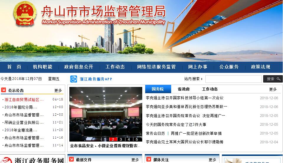 舟山市市场监督管理局主要职责:(一)贯彻执行国家、省、市有关工商行政管理、质量技术监督、食品药品监督管理等方面的法律、法规和政策;拟订相关规范性文件和政策、措施,经批准后监督实施。(二)拟订并组织实施市场监督管理事业发展规划和技术机构建设规划;组织推进质量发展工作;组织实施商标战略和名牌战略;指导广告业发展;参与制定商品交易市场发展规划。(三)负责涉及工商行政管理、质量技术监督、食品药品监督管理的各类行政审批和行政许可并监督管理。(四)组织指导查处违反工商行政管理、质量技术监督、食品药品监督管理法律、法规、规章的行为。(五)组织拟订并协调推进食品安全规划;依法承担食品安全综合协调工作;推动食品安全应急体系和隐患排查治理机制建设,按规定负责食品安全事故和突发事件的应对处置;依法统一发布重大食品安全信息;依法承担食品生产、食品流通及餐饮服务的安全监督管理职责;承担酒类、保健食品和化妆品市场监管职责。(六)依法承担对各类市场经营秩序监管责任;负责市场交易行为和网络交易行为及有关服务行为监管职责,维护公平竞争的市场经营秩序;依法负责个体工商户、私营企业经营行为的监督管理;组织开展企业信用体系建设,推进政府企业信用、行业信用建设,实施信用分类管理;依法监督管理经纪人、经纪机构及经纪活动;依法监督管理直销企业和直销人员及其直销行为,依法查处违法直销和传销案件;负责各类广告活动的监督管理工作。(七)依法管理和指导质量工作,负责质量宏观管理和产品(商品)质量监督检查工作;组织产品(商品)质量预警、监测工作;受委托组织协调较大产品(商品)质量事故的调查处理;组织实施质量奖励制度和缺陷产品(商品)召回制度。(八)依法承担消费者权益保护责任,建立消费者权益保护体系,组织指导消费维权工作;负责涉及工商行政管理、质量技术监督、食品药品监督管理的申诉和举报工作。(九)依法实施合同行政监督管理,规范合同行为;管理动产抵押物登记;组织实施合同格式条款备案;监督管理拍卖行为。(十)负责商标监督管理工作,依法保护商标专用权;推荐省著名商标,组织认定市著名商标;依法保护特殊标志、官方标志;负责地理标志产品日常监督管理工作。(十一)负责管理标准化工作;组织协调和指导推动各部门、各行业的标准化工作;依法组织制定地方标准规范;依法监督标准的实施;按照规定承担应对技术性贸易壁垒工作;管理组织机构代码和商品编码工作。(十二)负责管理计量工作;组织推行法定计量单位和国家计量制度;依法管理计量器具及量值传递和比对工作;负责规范和监督商品计量和市场计量行为。(十三)负责特种设备的安全监察工作;依法对特种设备生产(设计、制造、安装、改造、维修)、经营、使用、检验、检测等环节进行监督检查,负责特种设备行政许可项目的监督管理;按规定权限组织特种设备事故的调查处理;监督检查高耗能特种设备节能标准的执行情况。(十四)负责管理合格评定工作;依法负责检验机构及其检验服务活动的监督管理工作;规范和监督认证市场行为;负责工业产品生产许可证和能效标识的监督管理,推进实施国家相关产业政策。(十五)负责药品、医疗器械行政监督和技术监督。监督实施药品、医疗器械研制、生产、流通、使用方面的质量管理规范;负责药品、医疗器械注册的有关工作和监督管理;监督实施国家药品、医疗器械标准,组织开展药品不良反应和医疗器械不良事件监测;建立健全药品安全应急体系;配合有关部门实施国家基本药物制度;组织实施处方药和非处方药分类管理制度;组织实施执业药师资格和医药从业人员职业资格认定制度。(十六)组织实施中药、民族药监督管理规范和质量标准;监督实施中药材生产质量管理规范、中药饮片炮制规范,组织实施中药品种保护制度;监督管理城乡集贸市场的中药材交易;负责麻醉药品、精神药品、医疗用毒性药品、放射性药品及戒毒药品的监督管理。(十七)承办新区党工委、管委会和市委、市政府交办的其他事项。