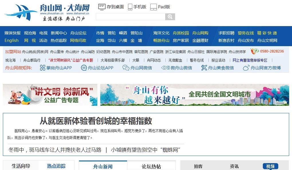 舟山网是浙江舟山群岛新区以新闻宣传为主的市级综合性门户网站,由舟山市委宣传部、舟山日报社和舟山广播电视总台联办,舟山日报社承办。机构设有:舟山国际互联网新闻中心,为自收自支事业单位,负责网站的新闻采编工作。舟山网络传媒有限公司,为国有全资公司,负责网站的经营工作。舟山网于2003年8月6日开通,2009年8月6日开始启用“大海网”域名,与舟山网的域名同时使用,进一步凸显海洋信息传播平台特色。2005年、2008年分别与舟山移动、舟山联通、舟山电信合办《舟山手机报》。2010年8月,建立了英语频道,向海外宣传舟山发展及海洋经济和人文类信息。近年来,舟山网围绕“海洋特色、主流媒体、舟山门户”的办网目标,不断开拓创新,积极探索特色办网之路,以努力打造区域性门户网站和海洋类门户网站为目标,目前已成为浙江舟山群岛新区影响力较大的综合性门户网站,并在全国海洋经济、海洋文化领域拥有了一定的知名度。同时通过改革网络经营体制,拓展视频等经营渠道,探索线上线下运作,发展服务类频道,新媒体产业保持快速增长势头,走上了良性发展的道路。舟山网除了设有舟山新闻、网闻天下、观沦海等新闻类栏目,还设有畅游舟山、海洋文化、舟山美食、金融理财、房产家居、舟山网视等频道,中国海洋文化在线等子网站,以及视频访谈类节目蓝色沟通、专题类栏目热点追踪等被市委宣传部命名的品牌栏目。舟山网旗下的社区平台舟山论坛,是舟山人气最旺的主力论坛,日发帖量超过5000帖,注册会员超过60万,同时在线人数超过万人,成为目前舟山网民理性讨论交流、网民与政府良性互动,舟山影响力最大,融导向引导与服务为一体的主流论坛。同时,为了更好地满足舟山论坛手机用户能够随时随地享用舟山论坛内容,正式推出了舟山论坛APP,为所有手机用户提供便捷、高速、灵活的“掌中论坛”。舟山网还不断强化服务功能,树立用户意识,在首页推出了网上舟山栏目,为网友提供天气预报、水电费、公积金、船班航期、公交线路、社保信息等的查询,为网友提供第一手的便民服务;舟山论坛推出了城市生活向导专栏为网友提供最新最快的服务信息。近年来,舟山网在采编工作上收获丰厚,荣获浙江新闻奖、舟山新闻奖、中国地市报新闻奖等近百个奖项。中国海洋文化在线荣获“浙江省文化传播创新十佳网站”称号;《千人护千佛 慈航宝岛行》获中国城市网站联盟精品奖;舟山论坛党报在线栏目荣获“首届中国城市新闻网站品牌栏目优秀奖”;“全国互联网看舟山”活动荣获中国海洋文化节“海蓝奖”;《舟山市非物质文化遗产网上展厅》(电子书)荣获第二届浙江省非物质文化遗产宣传报道“好专题”奖;《蓝色沟通》荣获2010——2011年度舟山市海洋文化精品名品奖。舟山网团支部被评为市级“青年文明号”,舟山网还荣获舟山市宣传工作先进集体、舟山市新闻媒体宣传人大制度先进集体称号。舟山网络传媒有限公司获舟山市第二批海洋经济创新团队荣誉,被评为首批舟山市成长型文化企业。
