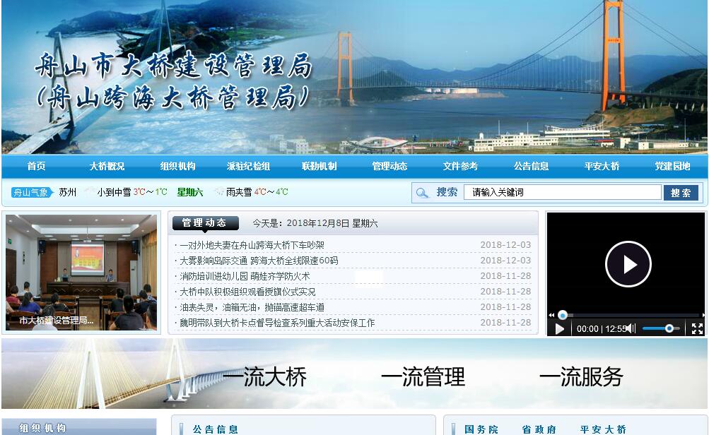 2013年8月,根据《中共浙江省委办公厅浙江省人民政府办公厅印发〈关于创新浙江舟山群岛新区行政体制的意见〉的通知》(浙委办发〔2013〕57号)和《中共舟山市委办公室舟山市人民政府办公室关于浙江舟山群岛新区(舟山市)事业机构设置与调整的通知》(舟委办发〔2013〕58号),设立舟山市大桥建设管理局,为相当于正县(处)级事业单位,由市交通运输局管理。将六横跨海大桥建设指挥部、市大陆连岛工程指挥部职责整合到舟山市大桥建设管理局。舟山跨海大桥管理局与舟山市大桥建设管理局合署办公。2013年10月,根据舟山市人民政府办公室关于印发《舟山市大桥建设管理局(舟山跨海大桥管理局)主要职责内设机构和人员编制规定》的通知(舟政办发〔2013〕152号)和2014年1月20日舟山市机构编制委员会《关于舟山市交通运输局事业单位清理规范方案的批复》(舟编[2014]18号),舟山市大桥建设管理局(舟山跨海大桥管理局)内设办公室、财务与审计处、技术业务处、项目前期处、工程综合处、安全管理处(征迁协调处)、执法协调处和监控指挥处。舟山市大桥建设管理局(舟山跨海大桥管理局)主要职责是:(一)负责市级大桥建设规划研究,对大桥建设必要性和可能性进行分析,为新区管委会和市政府决策提供依据。(二)负责市级拟建大桥和受委托大桥及代建大桥项目建议书、可行性研究报告、相关专题研究报告等的编制和报批。(三)负责制定市级拟建大桥和受委托大桥及代建大桥建设总体目标、方案,并组织实施;负责市级拟建大桥和受委托大桥及代建大桥工程建设管理,确保工程建设的质量、进度和安全,控制工程造价;组织实施项目招投标工作;负责项目科研及新技术、新工艺、新设备、新材料在工程建设中的开发与应用;负责工程交、竣工验收和项目后评价准备工作。(四)负责市级拟建大桥和受委托大桥及代建大桥科研平台的搭建。(五)负责县(区)重要大桥前期和建设期的技术指导和服务工作。(六)受委托负责市级已运营大桥安全和养护工作的综合协调和监管。根据《舟山跨海大桥管理暂行办法》(舟山市人民政府第30号令),负责舟山跨海大桥的管理工作。(七)承办新区党工委、管委会和市委、市政府及市交通运输局交办的其他事项。2013年11月5日,舟山市大桥建设管理局(舟山跨海大桥管理局)在双桥举行了挂牌仪式正式开始运作。