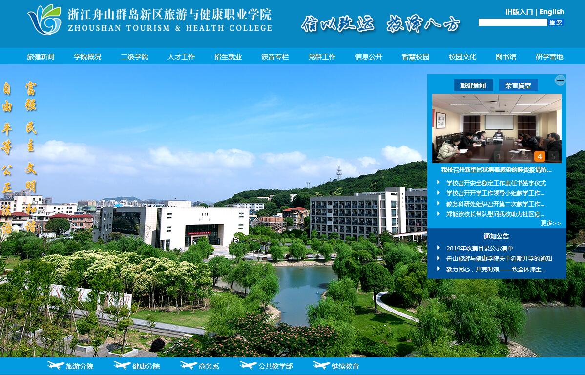 经浙江省人民政府批准建立、由舟山市人民政府主办、国家教育部备案的公办全日制普通高校,也是国内第一所以旅游与健康命名、培养旅游与健康融合型人才的高职院校。2014年9月,浙江省旅游局与舟山市人民政府签署共建学院框架协议。2015年3月,经省政府发文正式建校。2017年1月,波音舟山项目员工培训中心落户学院。2017年3月,舟山广播电视大学划转学院。2017年10月,成为浙江省旅游协会海洋旅游分会会长单位。坐落于中国“好空气”之都的舟山群岛新区和国家4A级旅游景区的朱家尖,阳光、沙滩、白云、青山每天伴随我们成长;“海天佛国”普陀山与我们隔海相望;近在咫尺的甬舟高速路、普陀山国际机场、舟山国际邮轮港依偎左右;金庸笔下桃花岛、沙雕故乡南沙滩、蓝堡游艇俱乐部、禅修圣地普陀山佛学院、普陀山观音法界观音圣坛簇拥周围;学院各类教学生活设施完备,是莘莘学子学习、生活、成才的理想之地。设有旅游分院、健康分院、商务系、公共教学部、继续教育学院(舟山电大),开设有健康管理、护理、护理(中韩合作,医疗美容方向)、助产、营养配餐、空中乘务、酒店管理、会计、电子商务、国际经济与贸易等高职专业,其中,护理(健康养老方向)、导游、休闲服务与管理为浙江省高校“十三五”特色专业。建有健康养老护理实训基地、旅游综合实训基地、财经商贸类综合实训基地等3个浙江省“十三五”高职教育示范性实训基地。坚持市场为需、育人为本,有行业能手、博士教授、资深专家、海归精英为主组成的师资队伍。坚持教学相长、以赛促教,师生屡获全国、全省各类专业技能竞赛及活动大奖,两年来先后获全国一等奖9个、二等奖10个、三等奖8个,全省一等奖2个、二等奖9个、三等奖9个。与深圳中航健康时尚集团和万豪国际集团、喜达屋国际酒店集团、雷迪森集团、海中洲集团等国内知名企业建有订单班。与美国温森斯大学、英国诺森比亚大学、韩国全南科技大学、新加坡科文学院、台湾餐旅大学、台北护理健康大学等20多所国(境)外高校签署合作协议或交流关系。正紧紧依托舟山群岛新区大开放大开发大发展国家战略,坚持“融合化、精品化、国际化”办学定位,积极走开放办学、特色办学、创新办学之路,加快实施人才撬动、融合发展、创新驱动“三大战略”,充分发挥波音舟山项目员工培训中心最大效应,着力打造产教融合示范基地、创新创业实践基地、海洋旅游服务基地、智慧健康体验基地,努力建成一所校园环境优美、人文气息浓厚、专业特色鲜明、具有核心竞争力的现代创业创新型高职院校。 天时地利人和,浙江舟山群岛新区旅游与健康职业学院必将与广大师生一起,迎接更加光辉灿烂的明天。
