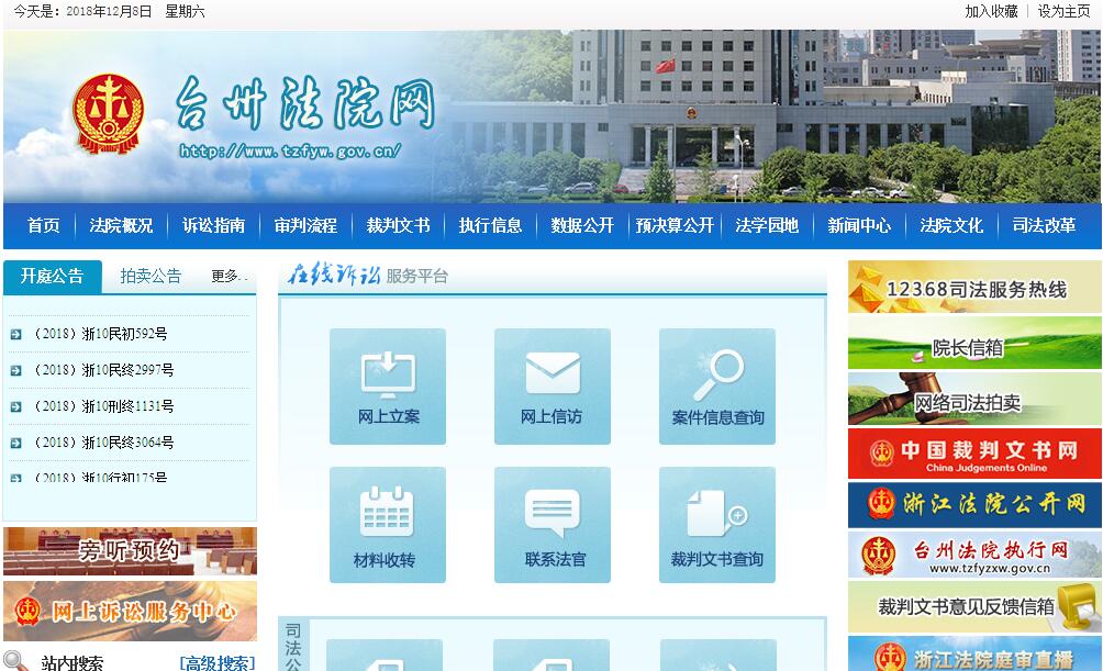台州市中级人民法院成立于1950年9月11日,时名浙江省人民法院台州分院。台州中院审判办公大楼位于台州经济开发区市府大道399号,占地33亩,建筑面积2.35万平方米,启用于2001年3月。台州中院内设职能部门23个,分别为办公室、组织人事处、宣传教育处、监察室、研究室、司法警察支队、审判管理处、司法鉴定处、司法行政装备管理处、机关党委、刑事审判第一庭、刑事审判第二庭、民事审判第一庭、民事审判第二庭、民事审判第三庭(知识产权庭)、行政审判庭、立案一庭、立案二庭、审判监督庭、减刑假释审判庭、执行庭、执行监督处、执行综合处。台州中院实际在编181人,其中中央政法专项编制163人、地方事业编制18人。在编行政、事业编制人员中,具有本科学历113人,研究生学历、硕士学位53人。台州市中级人民法院下辖椒江、黄岩、路桥三区,临海、温岭两市,玉环、天台、仙居、三门四县共9个基层法院,各基层法院设立有20个派出法庭。全市两级法院实际在编1356人,其中中央政法专项编制1238人,地方事业编制118人。在编人员具有大学本科以上文化程度1255名,占92.6%。2014年,全市法院在市委、市人大及其常委会、上级法院的领导、监督、指导下,在市政府、市政协和社会各界的关心支持下,忠实履行宪法和法律赋予的职责,各项工作取得新的进展。全市法院新收各类案件117501件,办结114410件,同比分别上升8.9%和7.51%,其中中级法院新收5098件,办结5134件,同比分别上升27.39%和33.21%。全市一线法官人均结案199.65件,是全国平均数的2.35倍。