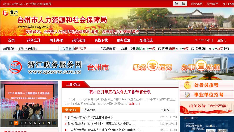 台州市人力资源和社会保障局主要职责是:(一)贯彻执行党和国家、省关于人力资源和社会保障工作的方针、政策和法律、法规、规章;起草人才开发、人事行政管理、劳动和社会保障工作规范性文件草案,拟订相应的政策及实施办法,并组织实施和监督检查。(二)根据《中华人民共和国公务员法》及有关法规和政策规定,会同有关部门拟订全市公务员分类、录用、考核、奖惩、任用、培训、辞退(辞职)、申诉、控告等政策规定和贯彻实施意见;负责行政机关实施公务员法的方案审批;牵头组织申报事业单位参照公务员法管理;拟订公务员职位分类标准和管理办法,依法对公务员实施监督,负责公务员信息统计管理工作。会同有关部门完善机关公务员考试录用制度,负责机关公务员、参照公务员法管理事业单位工作人员的考试录用工作。会同有关部门完善公务员考核制度,组织实施市级机关公务员年度考核工作;会同有关部门综合管理公务员培训工作,拟订公务员培训规划(计划)和标准;具体承办市行政学院管理有关工作和市政府人事任免手续。会同有关部门完善公务员申诉控告制度和聘任制公务员人事争议仲裁制度,保障公务员合法权益。组织和协调政府表彰奖励工作。(三)负责编制全市人力资源和社会保障事业发展规划,拟订机关企事业单位人事制度改革方案,劳动和社会保障制度改革方案并组织实施;负责全市人才人事、劳动和社会保障的统计工作。(四)综合管理全市人才开发工作;会同有关部门拟订和实施全市人才发展战略、规划和综合性政策;负责指导和协调全市人才选拔、培养、引进项目的组织实施;拟订人力资源市场发展规划和人力资源流动政策,建立统一规范的人力资源市场,促进人力资源的合理流动和有效配置。(五)负责促进就业工作。拟订统筹城乡的就业发展规划和政策,完善公共就业服务体系和就业援助制度;牵头拟订高校毕业生就业政策,负责毕业生离校后的就业指导和服务工作;负责中等专业学校毕业生就业的管理指导;开展就业援助,促进城乡就业困难人员就业再就业;建立健全就业、失业预测预警、监控分析制度,保持就业形势稳定;完善职业技能资格制度,统筹建立面向城乡劳动者的职业技能培训制度。(六)负责统筹城乡的社会保障体系。统筹拟订城乡社会保险及其补充保险政策和标准,逐步提高基金统筹层次;拟订市内社会保险关系转续政策;会同有关部门拟定社会保险基金、社会保险市级调剂金及补充社会保险基金管理和监督制度,组织编制社会保险基金预决算草案;组织实施社会保险基金的预测预警分析,拟订应对措施;管理所属社会保险经办机构,负责社会保险服务体系建设;负责各类补充保险相关内容的审核和备案。(七)会同有关部门拟订机关企事业单位人员工资收入分配政策,建立机关企事业单位人员工资正常增长和支付保障机制;拟订机关企事业单位人员福利和离退休政策;制定市直和部门所属事业单位工资总额和工资计划管理政策,负责市属机关事业单位人员和工资总额的管理和审核;负责企业职工工资的宏观调控工作。(八)会同有关部门指导全市事业单位改革和人事制度改革,拟订事业单位人员和机关工勤人员管理政策,综合管理事业单位人员的聘用、考核、培训、奖惩以及公开招聘、岗位设置管理等工作。(九)拟订专业技术人员管理和继续教育政策;牵头推进深化职称制度改革,组织实施专业技术职业资格,负责专业技术人员的资格评价和资格考试工作,归口管理博士后工作和留学人员来台州工作;拟订高技能人才培养和激励政策,会同有关部门拟订农村实用人才培养和激励政策。负责组织评选市“首席技师”工作。(十)负责全市引进国(境)外人才智力工作,拟订全市引进国(境)外人才智力政策;负责全市外国专家及港澳台专家的管理工作;归口管理全市出国(境)培训工作;负责促进国(境)外人才智力交流与合作工作。负责组织省“西湖友谊奖”评选的推荐工作。(十一)会同有关部门拟订军队转业干部安置政策和安置计划,负责军队转业干部教育培训工作,组织拟订部分企业军队转业干部解困和稳定政策,负责自主择业军队转业干部管理服务工作。(十二)会同有关部门拟订农民工工作综合性政策和规划,推动农民工相关政策的落实,协调解决重点难点问题,维护农民工合法权益。(十三)统筹拟订劳动、人事争议调解仲裁制度和劳动关系政策,完善劳动关系协调机制,制定消除非法使用童工政策和女工、未成年工的特殊劳动保护政策,制定完善工时制度和职工休假制度,组织实施劳动监察,协调劳动者维权工作,依法查处违法案件。(十四)承办市政府交办的其他事项。