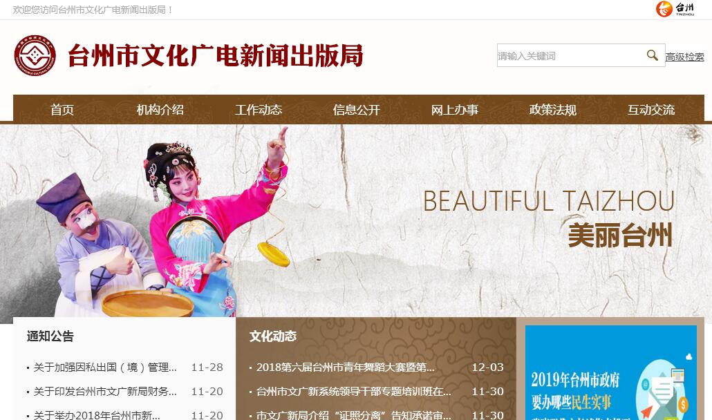 台州市文化广电新闻出版局是主管文化、文物、广播电影电视、新闻出版和版权工作的市政府工作部门。(一)贯彻执行党和国家关于文化、文物、广播电影电视、新闻出版和版权工作的法律法规和方针政策;拟订并监督实施全市文化、文物、广播电影电视、新闻出版事业发展规划;拟订全市文化、文物、广播电影电视、新闻出版管理规范性文件。(二)参与拟订全市文化产业发展规划和政策;参与市重点文化设施建设,根据市政府授权,管理相关市级国有公共文化设施。(三)综合管理、指导全市戏剧、音乐、舞蹈、曲艺、美术、文学、民间艺术、电影艺术等工作,重点抓好各门类艺术精品创作、制作管理和文化、文物、广播电影电视科技工作;负责各类艺术表演展示、艺术教育培训和辅导的管理,指导专业艺术团体业务建设和具有示范性的重大文化艺术活动。(四)指导图书馆、文化馆、博物馆、乡镇综合文化站以及基层文化俱乐部建设;推进全市非物质文化遗产的传承保护工作;指导群众文化活动。(五)负责全市广播电影电视行业管理,协调、监督全市广播电视安全播出,负责广播影视节目制作经营活动的监督管理,负责公共视听载体广播影视节目播放的监督管理;负责电影发行放映行业的规划和管理,指导全市农村数字电影放映工作。(六)负责全市文化市场、广播电影电视、新闻出版、版权等相关经营项目的审批、审核和监督管理,负责文化市场的行政执法,指导全市文化市场行政综合执法和执法队伍建设;负责版权保护工作,打击侵权盗版行为;负责办理文化市场行政复议案件;组织对全市各类内部资料出版物的审读。(七)按权限申报和实施全市文化、文物、广播电影电视、新闻出版对外文化交流计划和项目,推进对外交流和合作。(八)指导全市文物、博物馆(艺术馆、纪念馆)工作。负责初审、推荐全国、省、市级文物保护单位,审核公布市级文物保护点,协同市住房和城乡建设等部门负责国家级、省级历史文化名城、历史文化街区(村镇)的推荐、保护和管理工作,组织实施文物保护与抢救、修缮工作,申报考古调查勘探、考古发掘方案,指导全市文博单位业务建设,履行文物行政执法督察职责。(九)承办市政府交办的其他事项。