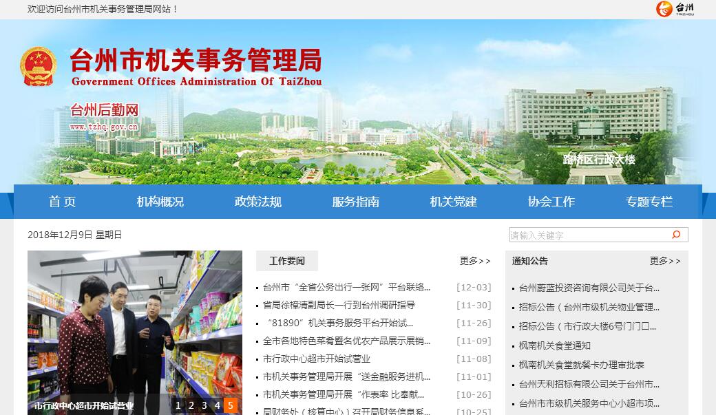 台州市机关事务管理局主要职责:1、根据党和国家的有关政策,结合我市实际,制定机关事务工作的具体规定和办法,并组织实施。贯彻执行国家和省有关机关事务工作的法规政策,负责拟订并组织实施有关全市机关事务管理的工作规划、制度和标准。负责对全市各级政府有关机关事务工作的指导。2、会同有关部门研究制定并组织实施全市机关后勤体制改革的政策和办法,推动全市机关后勤体制改革;负责对市级各部门和各县(市、区)后勤服务工作的指导和监督。3、负责市级机关部分帐户的管理和资金下拨工作;负责市级机关行政办公用房建设与维修项目等专项经费的管理。4、负责管理市政府委托的国有资产,组织制定相关具体制度和办法,承担产权界定、清查登记、资产处理工作。5、按照市政府的要求,做好市级机关办公用房的保障工作,拟订相关制度并组织实施;负责市级机关有关办公用房建设和分配工作。承担市级机关有关房产产权、产籍申报登记和与确权有关的工作,以及房屋修缮工作;在国土资源行政主管部门的指导下,对市级机关有关土地使用实行归口管理;监督局系统内基建项目。6、会同有关部门做好市级机关住房制度改革的具体工作;负责市政府交办的市级机关住房的建设、分配等工作。7、在市级节能管理工作部门的指导下,负责市级公共机构节能监督管理工作;指导市教育、科技、文化、卫生、体育等系统主管部门开展市级系统内公共机构节能工作;会同市级有关部门开展公共机构节能宣传、教育和培训,普及节能科学知识;参与推动公共机构节能。8、负责市级重要会议和重大活动的总务工作;负责市委、市政府交办的来宾接待工作。9、负责市级有关单位汽车的配备计划、更新等工作;负责市领导公务用车和市级重要会议、重大活动及市委、市政府来宾接待的车辆调度和安排;协助有关职能部门办理市直机关车辆的建档、调拨、转籍、过户、上牌、审验等手续。10、配合公安机关做好市级机关的综合治安管理和市级重要会议、重大活动的安全保卫工作;会同有关部门对市直机关的安全保卫、消防工作进行指导、检查和监督;负责市行政中心的公共秩序、安全保卫、爱国卫生、绿化美化、重要设备的管理与维护及其他后勤保障工作。11、协调和管理市级机关幼儿教育工作。12、承办市委、市政府交办的其他事项。