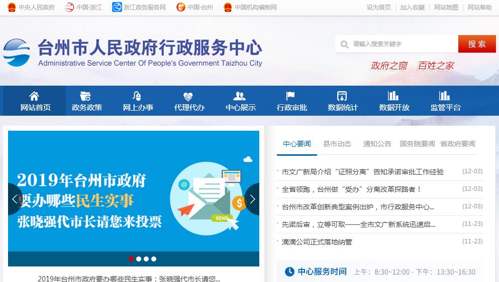 台州市人民政府行政服务中心于2001年7月2日经市委、市政府批准成立。中心管理机构(原名台州市人民政府办事大厅管理委员会)为台州市人民政府派出机构,规格为正处级行政单位。中心初建时设于台州经济开发区纬二路,共有27个部门384项审批项目入驻中心窗口办理。2005年12月,中心迁址市府大道新台州大厦四楼办公,并调整了部分窗口、项目及人员,入驻32个行政部门共278项行政审批许可及服务项目,提高了行政审批项目集中度,完善了审批服务和便民办事服务功能。 2015年11月,中心迁至台州市爱华路118号市科技馆一楼办公。目前政务服务办事大厅一楼面积4500平方米,进驻41个窗口单位;设置102个窗口,办理379项审批服务事项;二楼面积1200平方米,设立了商事登记、住房公积金等综合窗口。2013年,中心根据台政办[2013]132号文件,进行了机构主要职责、内设机构和人员编制的调整,调整后的台州市人民政府行政服务中心(台州市行政审批管理办公室、台州市公共资源交易管理委员会办公室),为市政府派出机构,机构规格正处级。负责台州市级行政审批服务和公共资源交易的组织、协调、指导工作。中心设立了台州市公共资源交易中心(台州市产权交易中心)为公益一类全额拨款事业单位,机构规格相当于副处级,依法组织实施政府采购、划工程建设(含建设、水利、交通工程、市重点工程等)招投标、土地出让、产权交易等活动的行政服务职能。设立了台州市行政审批代理服务中心(台州市行政审批服务信息中心),为公益一类全额拨款事业单位,机构规格相当于正科级,承担台州市级重大投资项目、企业投资项目、重大民生类服务项目行政审批全程代理代办服务管理、中心信息化管理,互联网+政务服务管理等工作职能。中心遵循“审批简、效率高、服务优”的服务宗旨,实行规范化服务。按照服务内容公开,办事程序公开,申报资料公开,承诺时限公开,收费标准公开,办事结果公开要求办理审批服务事项。要求一般事项当场办理制,特殊事项承诺办理制,重大事项联合办理制。对进入中心办理的审批服务事项,实行一个窗口受理和“一站式”服务。经过多年发展,中心完善了各项内部管理制度,规范窗口办事流程,建设了浙江政务服务网统一行政权力运行系统开展网上审批服务,创建设国家级行政审批标准化政务服务模式。围绕中心建立智慧政务服务大厅,办事群众免费体验无线WIFI系统(i-zhejian),办事公众和企业可通过排队叫号系统预约、8+x综合窗口一窗式受理服务、一网式办事评价,优化办事效率;大厅设置智能引导系统,实现办件信息公示、办事服务指南公开,2015年被评为全国百优行政服务大厅。根据发展,市政府先后批准设立了港航分中心、人力资源和社会保障分中心、公安出入境分中心、公安车辆管理分中心、台州湾循环经济产业集聚区行政服务分中心。中心建立了门户网站、台州市投资项目网上中介服务平台、台州市网上政务服务大厅移动APP(台州政务服务),开设了政务服务微信端(台州政务服务:tzzwfw、台州行政审批:tzxzsp)订阅号、服务号,实现更好的网上办事预受受理服务和中心政务信息公开,实现与浙江政务服务网统一账号单点登录。通过中心门户网站还可以实现审批许可事项网上办事申请、在线咨询投诉、下载办事表格等相关服务,通过不断优化行政审批服务,进一步优化了台州经济社会发展环境。
