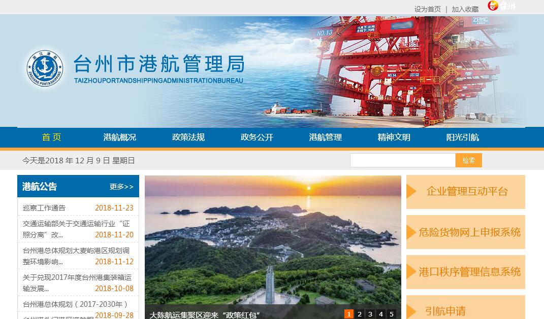 台州市港航管理局主要职责:1、负责全市航道和航运的行政执法和管理;2、执行国家有关港口、港口引航和船舶检验等法律、法规和行政规章,结合辖区实际,制定港章和有关管理规定;3、负责港口规划的编制、报批和组织实施交通主管部门编制的水运规划,对港口水域、陆域、岸线实施统一行政管理;4、负责对港区航道、防波堤、锚地等公用基础设施的建设、维护和管理工作,对港口建设市场秩序和港口建设项目的工程质量实施监督;5、负责对港口经营秩序、经营资质、安全生产、环境保护等实施行业监督和管理;6、协调运输船舶和港埠企业之间的关系,协助从业者处理重大客、货运输商务纠纷;7、负责划定危险货物作业泊位、库场的区域范围,并实施监督;8、负责引航事务管理,接省船检局的委托开展法定检验;9、负责港口、水运行业信息的统计和管理工作,及时汇集、发布、分析港口、水运信息,为港口和水运从业者提供咨询服务;10、负责协调国家重点物资、军事及抢险救灾等政府指令性物资运输;11、按国家规定征收各项港航事业规费,管理和监督港口经营性收费;12、负责港口企业从业人员的技术业务培训、考核和发证的管理工作;13、负责对辖区内各县(市、区)的港政工作进行检查、指导、监督;14、负责港口管理工作的监督、协调;15、承办市政府和上级交通主管部门交办的其他工作。