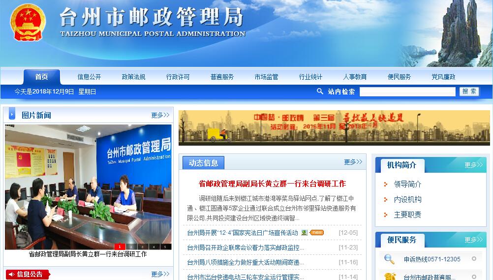 | 网站简介: 台州市邮政管理局主要职责:1、贯彻执行国家关于邮政业管理的法律法规、方针政策和邮政服务标准。2、监督管理所在地区邮政市场。3、组织协调所在地区邮政普遍服务以及机要通信、义务兵通信、党报党刊发行、盲人读物寄递等特殊服务的实施。4、办理国家邮政局、省邮政管理局交办的其他事项。 |