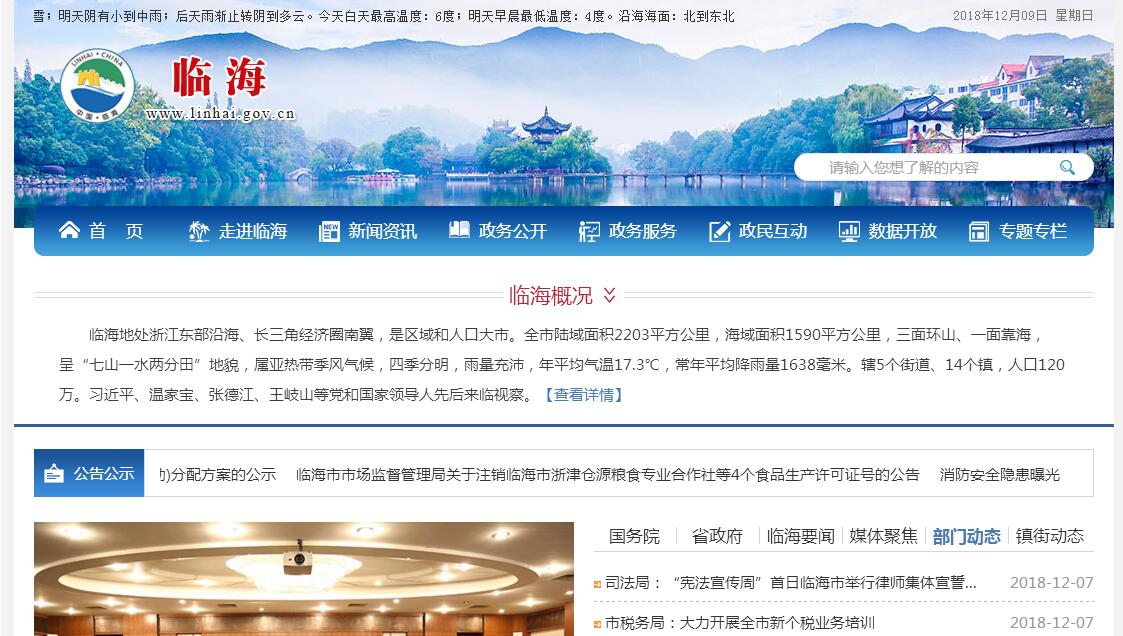 临海地处浙江东部沿海、长三角经济圈南翼,是区域和人口大市。全市陆域面积2203平方公里,海域面积1590平方公里,三面环山、一面靠海,呈“七山一水两分田”地貌,属亚热带季风气候,四季分明,雨量充沛,年平均气温17.3℃,常年平均降雨量1638毫米。辖5个街道、14个镇,人口120万。习近平、温家宝、张德江、王岐山等党和国家领导人先后来临视察。临海市委市政府坚决贯彻中央会议精神和习近平总书记系列重要讲话精神,围绕省委省政府以及台州市委市政府一系列决策部署,提出了“打造全面小康标杆市,再创千年古城新辉煌,建设活力品质幸福临海”的奋斗目标,全面实施“改革创新,开放兴市;转型升级,产业强市;全域共建,品质立市”三大战略和“沿海沿江开发,建设海上丝路新门户;产业创新转型,提升经济发展新能级;城乡品质提升,打造山海水城新典范;民生事业共建共享,构筑幸福和谐新家园;体制机制创新,增强改革发展新动力”五大行动,经济社会发展态势良好。2017年,经济实力和综合竞争力位居全国百强县,财政总收入接近百亿元,进入“百强百亿”的崭新时代;实现生产总值600.25亿元,增长8%,总量位居全省28位,跻身全省振兴实体经济18个重点县(市、区);财政总收入97.7亿元,增长27.9%,增速居全省第一,增长额居台州第一;地方财政收入54.3亿元,增长19.1%,增速和增长额均居台州第一,位列全省各县市区第18位;规上工业总产值886.5亿元,增长27.6%,总量居台州第一,增速居全省第一;规上工业增加值181.8亿元,增长14.2%,总量居台州第一,增速居台州第一、全省第三;城镇常住居民人均可支配收入47309元,农村常住居民人均可支配收入25052元,增长9.2%。2016、2017年连续两年获得台州市县(市、区)经济社会发展目标责任制考核、党建考核“双优秀”。临海历史悠久,底蕴深厚。早在10万年前,就有“灵江人”在此繁衍生息。汉昭帝始元二年(前85),置回浦县,孙吴会稽王太平二年(257),设临海郡,唐高祖武德四年(621)置台州,置县设郡已有2000年,是浙江省首个获批国家历史文化名城的县级市,历史上曾留下了文武五状元、同朝五宰辅、兄弟四进士、父子三巡抚等千古佳话,谢灵运、郑虔、骆宾王、朱熹、戚继光、徐霞客、朱自清等诸多名人大家都在临海留下了历史印记。素有“小邹鲁”和“千年台州府,满街文化人”的美誉,“江南长城”台州府城墙、戚继光抗倭卫所桃渚城、明清紫阳古街、唐朝龙兴古寺、宋代东湖园林、唐宋元巾山群塔及骆宾王祠、郑广文祠、文庙等古迹星罗棋布。台州府城墙入选中国世界文化遗产预备名录,紫阳街入选中国历史文化名街。1986年3月1日,国务院批准临海撤县设市。2005年,与韩国横城郡结为友好城市。临海山海秀丽,生态优越。临海素有“海山仙子国”的美誉,浙江省第三大水系灵江贯穿全境,浙东南第一高峰括苍山是是国家级森林公园、中国大陆21世纪第一缕阳光首照地,台州府城文化旅游区通过国家5A景区景观质量评估,桃渚风景区列入第九批国家级风景名胜区,灵湖景区获中国人居环境范例奖,“千年古城,更忆临海”旅游品牌深入人心。全市森林覆盖率64.2%,城市绿地覆盖率41%,是国家园林城市、国家卫生城市、中国优秀旅游城市、中国宜居城市。城市化进程较快,建成区面积42.75平方公里、人口35万,是浙江城市群规划中列入大城市规划的3个县级市之一,是第一批“浙江美丽县城”试点市。城市建设从“东湖时代”迈向“灵湖时代”。临海交通便捷,海洋开发前景广阔。临海是台州的几何中心,是台州及浙江沿海中部的路上交通枢纽。境内铁路、高速、国道、省道纵横交错,共有铁路1条、高速公路4条、高速道口8个,在建铁路1条,筹建高铁1条、轨道交通2条、在建高速2条,公路总里程达2307公里,约占台州的三分之一。海洋经济发展前景广阔,头门港可利用岸线长度28.8公里,可建万吨以上泊位84个,后方可围垦面积近100平方公里。与省海港集团合作共同开发头门港,2014年12月26日顺利开港,疏港公路(跨海大桥)建成,首座2万吨级兼靠3万吨级泊位投运。临海经济发达,区域综合实力显著提升。临海是沿海首批开放城市,拥有浙江头门港经济开发区、浙江临海经济开发区2个省级经济开发区,诞生了全国第一家股份制企业。工业以现代医药、汽车机械、时尚休闲三大产业为主导,为国家外贸转型升级专业示范基地、省现代产业集群转型升级示范区、省汽车及零部件智能制造试点示范市,拥有上市企业7家、新三板挂牌企业14家,伟星集团列2017年中国民营企业500强第325位,华海药业是国内唯一一家将医药制剂产品打入欧美市场的企业,全国首辆民营企业生产的轿车和第一辆国产跑车均在临海下线,吉利汽车临海基地装备了世界一流的智能生产线。农业拥有柑橘、茶叶、杨梅、西兰花四大“国”字号品牌。服务业快速发展,临海列为农村金融改革试验区、省金融创新示范市,中国电子商务百佳县,农村普惠金融走在全省前列,小额丰收贷款卡入选全省“十大民生工程”。临海社会事业全面进步,社会大局保持和谐稳定。临海是台州文化之源,拥有台州医院、台州学院等一批名院名校,是全国文化先进市、全国体育先进市、全国基层政务公开标准化规范化试点市、省教育强市、省卫生应急工作示范市。连续13年成为省“平安县(市)”,夺得首批“平安金鼎”。