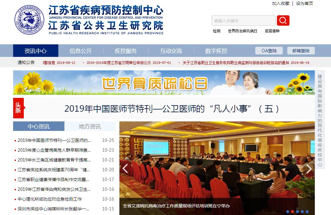 2000年10月,经省政府(苏编〔2000〕21号和44号)批准,由原江苏省卫生防疫站(省结核病防治所)、江苏省职业病防治所(省职业病防治院)、江苏省卫生宣传教育所和江苏省皮肤病防治研究所(省性病监测中心)合并组建江苏省疾病预防控制中心,是直属江苏省卫生和计划生育委员会领导的主要从事疾病预防控制工作的公益性事业单位。2002年3月、2008年7月增挂江苏省卫生检测检验中心、江苏省公共卫生研究院。2013年,加挂“国家食品安全风险监测江苏中心”和首批“国家食品安全风险监测参比实验室(有机污染物)”。2015年,加挂江苏省公共卫生实践教育中心。2014年成功建设申报“国家医师资格考试实践技能考试与考官培训基地(公卫类别)”。中心现有在职在编职工487名,其中,专业技术人员440人,研究生以上学历205人,正高级技术职务73人,副高级技术职务94人。现辖31个部门(室、科、所),其中职能部门9个、业务部门18个,其它科室3个,主要有急性传染病防制、慢性传染病防制、慢性非传染病防制、性病与艾滋病防制、免疫规划、消毒与媒介生物防制、食品安全与评价、儿童青少年健康促进所(学生健康管理办公室)、环境疾病(地方病)防制、放射防护、职业病防治、毒理与功能评价、理化检验、病原微生物研究、健康教育与健康促进、公共卫生信息等专业部门,主办《江苏预防医学》、《江苏卫生保健》杂志。中心成立以来,不断提升装备水平,改造完善基础设施,占地面积2.79万平米,2014年省突发公共卫生应急处置中心大楼建成并投入使用。办公科研实验用房达4万平米,固定资产4.04亿,50万元以上仪器设备146台2.31亿。2012年,建成国家卫生计生委“急性传染病防控队伍”和“核和辐射突发事件卫生应急队伍”两支国家级应急队伍。中心成立以来,以国家科技重大专项和省“科教兴卫”工程为牵引,以卫生部肠道病原微生物重点实验室为平台,应用研究成就斐然,连年攀升,先后获得各级各类科技奖114项。其中省部级科技成果一等奖1项、二等奖9项、三等奖17项,市厅级科技成果一等奖26项、二等奖45项、三等奖16项,“十三五” 科教兴卫工程立项创新平台1个,重点学科1个,创新团队2个,重点人才3人;“职业病临床”获批“卫生重点临床专科”。主持国家级、省部级课题101项,其中科技部国家重大专项1项(2009、2011、2013、2015),科技部863计划1项,国家自然科学基金21项,省自然科学基金、支撑计划、临床专项46项,其他部委及人才培养项目32项;承担或参与制定国家标准170项,发表论文3173篇,SCI收录论文从无到有,累计发表380篇,其中《Journal of the Lancet》发表7篇,《The New England Journal of Medicine》发表6篇,《Nature Genetics》1篇,最高影响因子55.873,目前拥有软件著作权34项,发明专利19项,实用新型专利专利权维持12项,标志着中心科研、监测、检测、应急、防控能力逐年跃升,有力保障和促进全省公共卫生事业发展。中心在江苏省委省政府和省卫生计生委正确领导下,在社会各界大力支持下,坚持以邓小平理论、“三个代表”重要思想和党的十八大精神为指导,以建成具有国际影响力的现代化省级疾病预防控制中心为目标,贯彻科学发展观,积极倡导“团结、奋进、求实、创新”的中心精神,依据国家法律法规,始终坚持“预防为主”的卫生工作方针,认真履行疾病预防与控制、突发公共卫生事件应急处置、疫情及健康相关因素信息管理、健康危害因素监测与干预、实验室检测检验与评价、健康教育与健康促进、技术管理及应用研究指导等职能,紧紧围绕重大疾病防制策略,爱岗敬业、勇于进取,开拓创新、创先争优,成功应对“9.14”汤山投毒、“非典”疫情、禽流感疫情、手足口病、甲型H1N1流感、婴幼儿毒奶粉、“小龙虾”事件、瘦肉精、地沟油、人感染H7N9禽流感等多起突发公共事件,圆满完成援非抗埃国际救援保障任务,支援保障北京奥运、上海世博会、南京青奥会,特别是在应急救援“5.12”汶川特大地震、“4.20”雅安地震和“6.23”盐城龙卷风冰雹特别重大灾害、对口支援西藏拉萨、新疆伊犁和克州、四川绵竹等项目中,锻炼了队伍,展现了风貌,树起了形象,赢得了赞誉。先后荣获中共中央精神文明建设指导委员会“全国文明单位”, 中组部“全国防治‘非典’工作先进基层党组织”, 人事部、卫生部、国家中医药管理局“全国卫生系统抗击非典先进集体”、“全国卫生系统先进集体”, 卫生部、国家食品药品监督管理局、国家中医药管理局、总后勤部卫生部“抗震救灾医药卫生先进集体”,人社部、国家卫生计生委“全国艾滋病防治工作先进集体”,人社部、国家卫计委、中宣部、外交部、商务部、解放军总政治部、解放军总后勤部“埃搏拉出血热疫情防控先进集体”, 国家卫生计生委“全国疾病预防控制工作先进集体”, 中华全国总工会“全国五一劳动奖状”,中国教科文卫体工会全国委员会“全国教科文卫体系统模范职工之家”,江苏省总工会“江苏省五一劳动奖状”、“工人先锋号”、“模范职工之家”,江苏省委省政府“全省防治‘非典’工作先进集体”、“江苏省文明单位标兵”等国家级和省部级表彰100多项。