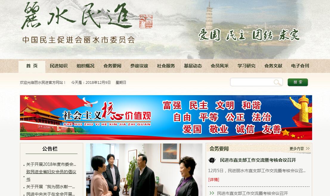 中国民主促进会(简称民进)是以从事教育文化出版工作的高中级知识分子为主、具有政治联盟性质、致力于中国特色社会主义事业的政党。民进是同中国共产党通力合作的参政党,是爱国统一战线的组成部分,是发展先进生产力、社会主义民主政治、社会主义先进文化和构建社会主义和谐社会,实现祖国统一、民族振兴的一支重要力量。民进自1945年12月30日创立以来,在中国共产党的指引和帮助下,积极投入反内战、反独裁的爱国民主运动,为争取新民主主义革命的胜利和建立中华人民共和国,作出了重要贡献,谱写了革命的光荣历史。新中国成立后,民进努力促进社会主义各项事业发展,为建立和完善社会主义制度,推进改革开放和现代化建设,促进祖国统一发挥了积极作用。坚持接受中国共产党的领导,坚持爱国、民主、团结、求实,坚持立会为公,是民进的优良传统。民进中央历届主席有马叙伦、周建人、叶圣陶、雷洁琼、许嘉璐、严隽琪。现任主席是蔡达峰。中共十一届三中全会以后加强了统一战线工作,民进浙江省委会为适应形势发展的需要,开始在丽水发展会员。1982年9月,时任丽水师专中文系主任、省政协委员的朱延春同志成为丽水第一位民进会员。1985年1月,成立了民进丽水县支部筹备组,同年2月成立民进丽水县支部。1986年11月,民进丽水市(县级)委员会成立,时有会员54人。2000年8月撤地设市后,民进丽水市(县级)委员会更名为民进丽水市莲都区委员会,2001年11月,成立民进丽水市委会。民进丽水市委会成立以来,高举中国特色社会主义伟大旗帜,深入学习贯彻科学发展观,以政治交接为主线,以思想建设为核心,以参政议政为重点,以建设高素质参政党为目标,围绕推进丽水科学发展、和谐发展、跨越发展,认真履行职能,积极建言献策,以新的面貌、新的姿态、新的形象出现在我市多党合作的政治舞台上,为丽水建设生态文明和全面小康社会作出了积极贡献。民进丽水市委会现辖莲都区委员会,缙云县、遂昌县总支部和景宁县支部以及市综合、市教育、丽水学院、丽水职业技术学院、丽水中学、市医卫、市中心医院支部、市科技、市人民医院等9个市直支部,有基层组织24个。截至2017年底,有会员518人,其中莲都区委员会81人,缙云县总支97人,遂昌县总支100人,景宁县支部12人,市综合支部35人,市教育支部26人,丽水学院支部31人,丽水职业技术学院支部15人,丽水中学支部31人,市医卫支部22人,市中心医院支部支部29人,市科技支部26人、市人民医院支部13人。平均年龄53岁。女会员237人,占45.8%,离退休会员161人,占31.1%。会员中大学文化程度以上353人,占68.1%,其中博士1人,硕士研究生31人;中高级职称465人,占89.8%;其中,教育界231人,占44.6%(高等教育43人,占8.3%,普通教育188人,占36.3%);文化出版界39人,占7.5%;医卫界99人,占19.1%;科技界27人,占5.2%;新的社会阶层38人,占7.3%,政府机关57人,占11%,其他(公有制经济、社会团体、人大政协和司法机关等)27人,占5.2%。会员中厅级干部2人,处级干部9人,乡科级干部27人;省、市、县人大代表8人,省、市、县政协委员63人。民进丽水市一届委员会主任委员庄志清,副主任委员蓝献华、李新雄(专职),委员吕楚金、郑根明、杨志勇、李水福、吴越滨、马翔华、金卓杏,秘书长李新雄(兼),副秘书长梁红、孙龙基。民进丽水市二届委员会主任委员庄志清,副主任委员李新雄、梁红(专职)、卢彩柳,委员蓝献华、吕楚金、马翔华、郑根明、李水福、吴越滨、金卓杏、胡晓红、李伟静,秘书长梁红(兼)。民进丽水市三届委员会主任委员庄志清,副主任委员卢彩柳、何灵(专职)、邱旭平,委员蓝献华、李潘良、马翔华、郑根明、李水福、金卓杏、胡晓红、刘美娟、郑丽丹,秘书长何灵(兼)。民进丽水市四届委员会主任委员卢彩柳,副主任委员何灵、邱旭平、陈荣富,委员胡晓红、李美华、刘美娟、童朝旭、李潘良、蓝利明、郑丽丹、吕国元、潘竹贤、吴丽强,秘书长邱旭平(兼)。民进丽水市委会下设办公室,建有统战理论研究小组,妇女工作委员会、老龄工作委员会和市区文化、教育、卫生、经济四个参政议政专委会。有丽水开明画院和民进丽水市企业家联谊会两个社团组织。民进丽水市委会机关刊物是《丽水民进》杂志。