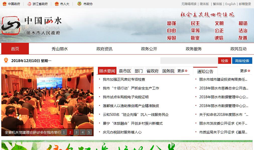 丽水地处浙江省西南部,古名处州。据《名胜志》记载,“隋开皇九年,处士星见于分野,因置处州。”因少微星座的“人才之星”处士星明耀分野而设处州。市域面积1.73万平方公里,是全省面积最大的地级市(占全国的1/600,全省的1/6),辖9个县(市、区)(莲都区、龙泉市和青田、云和、庆元、缙云、遂昌、松阳、景宁),总人口269万。主要特点可以概括为“三个城”:丽水是美不胜收的生态名城。丽水有着无与伦比的生态优势,素有“中国生态第一市”的美誉。山是江浙之巅,水是六江之源。长三角(江浙沪皖)最高的山在丽水,最清的水在丽水,最好的空气在丽水,瓯江、钱塘江、闽江、飞云江、灵江和福安江的源头都在丽水。全市森林覆盖率达到81.7%,丽水生态环境状况指数连续14年全省第一,生态环境质量公众满意度连续10年全省第一、全国领先。2002年,习总书记第一次来到丽水,就由衷赞叹:“秀山丽水、天生丽质”。丽水是积淀深厚的文化名城。丽水是浙江省历史文化名城、是中国地级市第一个民间艺术之乡,历史文化遗存丰富。蜚声中外的龙泉青瓷、龙泉宝剑、青田石雕被誉为“丽水三宝”。全市共有3项联合国人类非物质文化遗产(龙泉青瓷、丽水木拱廊桥、遂昌班春劝农),18项国家级非物质文化遗产;建造了全世界最古老拱形水坝、首批世界排灌工程遗产的通济堰;还有50个国家级、省级历史文化名城名镇名村,158个国家级传统村落,是华东地区古村落数量最多、风貌最完整的地区,被誉为“江南最后的秘境”。明代汤显祖曾任遂昌县令,在此期间创作了中国文学史上脍炙人口的《牡丹亭》,被誉为“东方的莎士比亚”。丽水是人们心驰神往的旅游名城。丽水全域就是一个千姿百态的大花园,9个县(市、区)各具特色,是中国优秀旅游城市、国家全域旅游示范区、国际休闲养生城市。全市有20家4A级以上的高等级景区,2725个美丽乡村镶嵌在绿水青山间,犹如一幅幅美丽的风景画。如诗如画的美丽风光,让各方游客趋之若鹜,这几年随着“高铁时代”的到来,游客呈现井喷式增长。可以说,这是一座自然风光秀美、人文底蕴深厚,充满活力、朝气蓬勃的城市。丽水是习总书记“绿水青山就是金山银山”思想的重要发源地。习总书记在浙江工作期间,先后八次来到丽水,深情寄语“绿水青山就是金山银山,对丽水来说尤为如此”“志不求易、事不避难”等殷殷嘱托。近年来,历届丽水市委、市政府始终以省委“八八战略”为总纲,在奋力打开“两山”通道上持续发力,经济社会保持了平稳较快发展:一是生态环境质量持续领先。今年上半年,全市96个地表水环境功能区监测断面水质达标率为99.0%;12个国控“水十条”考核断面水质均满足功能区要求并达到考核目标要求,Ⅰ~Ⅲ类断面比例为100%。空气质量全国第七;市区PM2.5平均浓度为31微克/立方米,全省第二;平均优良天数比例为93.9%,全省第一。二是综合实力持续提升。今年上半年,实现地区生产总值增长8.1%,增幅居全省第三;规上工业增加值增长10.6%,增幅居全省第二;一般公共预算收入增长19.8%,增幅居全省第五;社会消费品零售总额增长12.1%,增幅居全省第二。三是民生福祉持续改善。农民收入增幅连续9年全省第一;“五水共治”满意度、群众安全感满意率连续4年全省第一,食品安全满意度连续9年第一,生态环境质量公众满意度连续10年第一。上半年,城镇居民人均可支配收入增长9.1%,增幅居全省第一;农村居民人均可支配收入增长9.7%,增幅居全省第二。今年4月26日,习近平总书记在深入推动长江经济带发展座谈会上,对丽水15年来深入践行“八八战略”、12年来牢记“尤为如此”重要嘱托,探索实践“两山”转换通道,不断开辟“绿水青山就是金山银山”新境界予以充分肯定,作出了“丽水之赞”。习总书记强调指出:浙江丽水市多年来坚持走绿色发展道路,坚定不移保护绿水青山这个‘金饭碗’,努力把绿水青山蕴含的生态产品价值转化为金山银山,生态环境质量、发展进程指数、农民收入增幅多年位居全省第一,实现了生态文明建设、脱贫攻坚、乡村振兴协同推进。当前,全市上下正以“丽水之干”担纲“丽水之赞”,高质量谱写“八八战略”丽水新篇章。