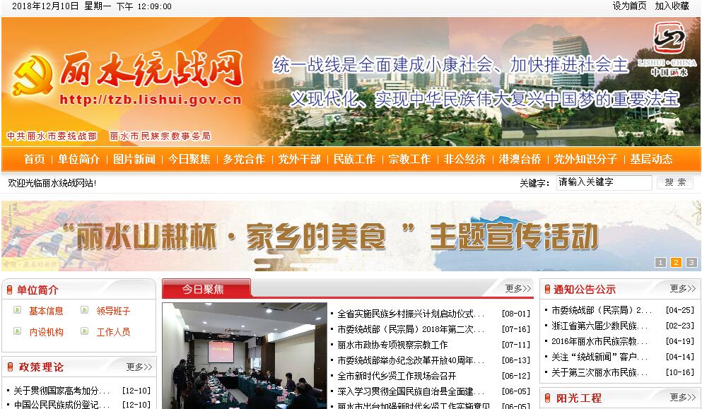 丽水市委统战部是市委主管统一战线工作的工作部门,市民族宗教事务局是主管民族与宗教事务的市政府组成部门,两者合署办公。其主要职责:一、市委统战部。1.组织贯彻执行中央、省委和市委关于统一战线的方针、政策、指示、决议;负责协调市级重大统战活动,督促检查各项统战方针政策的贯彻落实情况;向市委反映党外各界人士的意见和建议,协助做好思想政治工作。2.负责联系各民主党派和无党派代表人士;协助市委贯彻中国共产党领导的多党合作和政治协商制度,发挥市级各民主党派参政议政和民主监督作用;支持、帮助市级各民主党派开展工作,加强自身建设。3.负责调查研究有关民族、宗教工作的方针、政策问题;协调全市宗教专项工作;联系少数民族和宗教界代表人物;协助有关部门做好少数民族干部培养和举荐工作。4.负责开展以祖国统一为重点的港澳台和海外统战工作;联系港、澳、海外有关社团及代表人士;联系台湾各界人士,做好台胞、台属有关工作。5.负责党外人士的政治安排,会同有关部门做好培养、选拔、推荐党外人士担任政府和司法机关领导职务工作;做好党外后备干部和新的代表人物队伍建设工作;协助民主党派市委会、市工商联等团体做好干部管理工作。6.负责开展经济领域统战工作;受市委委托领导市工商联党组;指导工商联工作;调查研究并反映我市非公有制经济代表人士的情况,协调关系,提出政策建议;联系非公有制经济代表人士,做好思想政治工作。7.掌握党外知识分子的情况,反映意见,协调关系,提出政策建议;联系、培养党外知识分子代表人物,会同有关部门做好政治、生活待遇的安排。8.协同有关部门开展海内外统一战线宣传工作。9.管理丽水海外联谊会、统战理论学会。10.负责指导县(市、区)党委统战部门工作,协调各有关部门统战工作;指导市侨联工作,代管市台联等有关团体,并在人事安排和贯彻统战政策方面进行指导。11.承担市委和上级业务部门交办的其他事项。二、市民族宗教事务局。1.贯彻党中央、国务院关于民族、宗教工作的方针政策和国家法律法规;依法管理民族宗教事务,组织开展民族、宗教问题的调查研究,结合本市实际,制订民族、宗教方面的具体政策,对有关民族宗教政策、法律法规的贯彻实施进行监督。2.组织指导民族宗教政策、法律法规的宣传教育工作。3.指导、监督民族区域自治制度建设和民族区域自治法的贯彻实施,监督办理少数民族权益保障事宜;协调处理民族关系中的重大事宜,维护社会和谐稳定。4.协助组织、人事部门做好少数民族干部培养选拔工作,联系少数民族干部;组织培训全市民族、宗教工作干部。5.指导民族地区制订经济社会发展规划,研究提出推动民族地区经济发展的政策和措施;会同有关部门加强经济发达地区与民族地区对口支援工作;会同有关部门做好民族地区扶贫工作;组织协调民族地区科技发展、经济技术协作和民族贸易、民族特需用品生产等事宜。6.研究少数民族文化、艺术、卫生、体育、新闻出版等方面的特殊问题,并提出相关意见,承办相应事务。7.研究民族教育发展问题并提出意见和建议,配合教育主管部门承办民族地区教育援助和扶持的有关事宜。8.依法保护公民宗教信仰自由,保护宗教团体和宗教活动场所的合法权利,保护宗教教职人员履行正常的教务活动,保护信教群众正常的宗教活动。9.依法处置宗教领域违规违法活动,引导、促进宗教与社会主义社会相适应。10.推动宗教界人士进行爱国主义、社会主义、拥护祖国统一和民族团结的自我教育,巩固发展民族宗教界的爱国统一战线,团结和动员广大信教群众为经济建设、社会和谐服务。11.依法管理宗教团体,支持宗教团体加强自身建设,联系宗教界中上层人士;办理宗教团体需由政府机关协助或协调办理的各项事务。12.组织协调民族宗教工作领域的对外交流活动;支持和帮助宗教界开展对外和对香港特别行政区、澳门特别行政区、台湾地区友好活动,并办理有关事宜;办理居住境外少数民族同胞回国探亲、旅游、定居等有关事宜。13.协助县(市、区)人民政府处理民族、宗教方面的突发性事件和影响社会稳定的问题;指导县(市、区)人民政府民族、宗教部门业务工作。14.承办市政府和上级业务部门交办的其他事项。