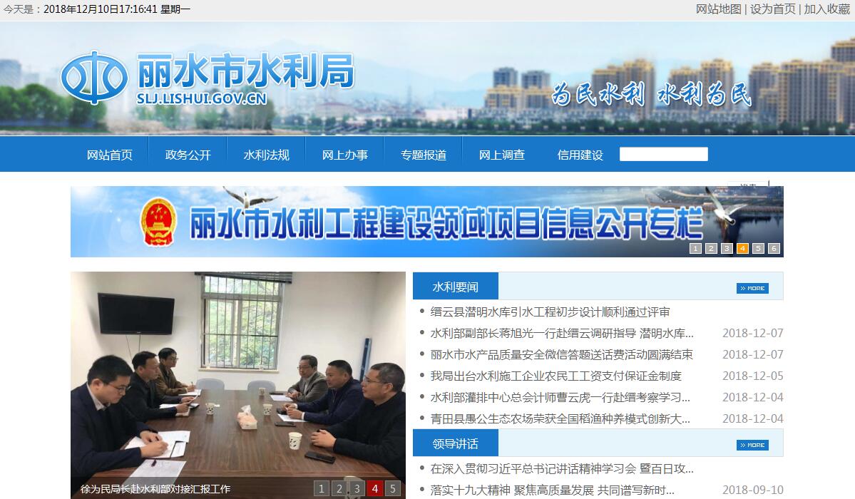 丽水市水利局主要职责:(一)贯彻执行《水法》、《水土保持法》、《防洪法》、《渔业法》等法律、法规;组织制定水利和渔业产业发展的规划、计划,并监督实施;研究制订水利、水产发展的有关政策;组织制订市级河道及跨县(市)流域综合规划和有关专业规划,并监督实施;组织审查各县(市)流域综合规划和有关专业规划。(二)统一管理水资源(含空中水、地表水、地下水)、渔业资源及水生生物资源;制订全市水资源、渔业资源开发、利用、保护配置规划和全市、跨县(市)地域水长期供求计划、水量分配方案,并监督实施;组织有关国民经济总体规划、城市规划及重要建设项目的水资源和防洪的论证工作;实施取水许可证、水土保持合格证和跨县(市、区)作业的渔业捕捞许可证、水产养殖使用证制度及水资源费、渔业资源增殖保护费征收制度;发布全市水资源公报;指导全市水文工作。(三)组织、指导和监督全市节约用水工作;编制节约用水规划,制订水资源保护规划;组织水功能区的划分和向饮水区等水域排污的控制;监测江河水库的水量、水质,审定水域纳污能力,提出限制排污总量的意见;组织指导渔业水域生态环境的监测和保护工作,并将有关数据和情况通报市环保部门。(四)组织、指导水行政执法和渔业行政执法;协调并仲裁部门间和县(市、区)间的水事纠纷和渔事纠纷。(五)编制、审查市级水利、水电、渔业基建项目建议书,审查县级水利、水电基建项目建议书和可行性报告;组织水利、水电、渔业科学研究和技术推广;组织指导水利、水电、渔业基建项目的建设管理;监督实施水利、水电、渔业的法律法规、行业技术质量标准和水利、水电工程的规程、规范;组织指导水利、水电设施、水域及其岸线的管理与保护;组织指导市级河道、水库、滩涂的综合治理和开发;管理河道采砂;组织建设和管理具有控制性的或跨县(市)域的重要水工程;组织指导水利、水电工程的运行管理和安全监管。(六)组织、协调、监督、指导全市防汛防旱工作和水土保持工作,负责市政府防汛防旱指挥部和市水土保持委员会的日常工作;组织实施市本级、指导全市城市防洪工作。(七)指导农村水利工作;组织协调农田水利基本建设、农村水电电气化和乡镇供水工作。(八)负责水利与渔业科技、教育、对外合作工作;指导全市水利、渔业队伍建设。(九)制订水利行业的经济调节措施;对水利资金的使用进行宏观调节;指导水利行业的供水、水电、水产养殖等多种经营工作;研究提出有关水利的价格、税收、信贷、财务等经济调节意见。(十)负责渔业行业管理,指导全市水产养殖、捕捞、加工、流通等;组织实施渔业生产经营许可证制度;组织实施水生动物防疫、检疫工作,负责水产品质量、水产种苗生产的监督管理。(十一)承办市政府交办的其他事项。