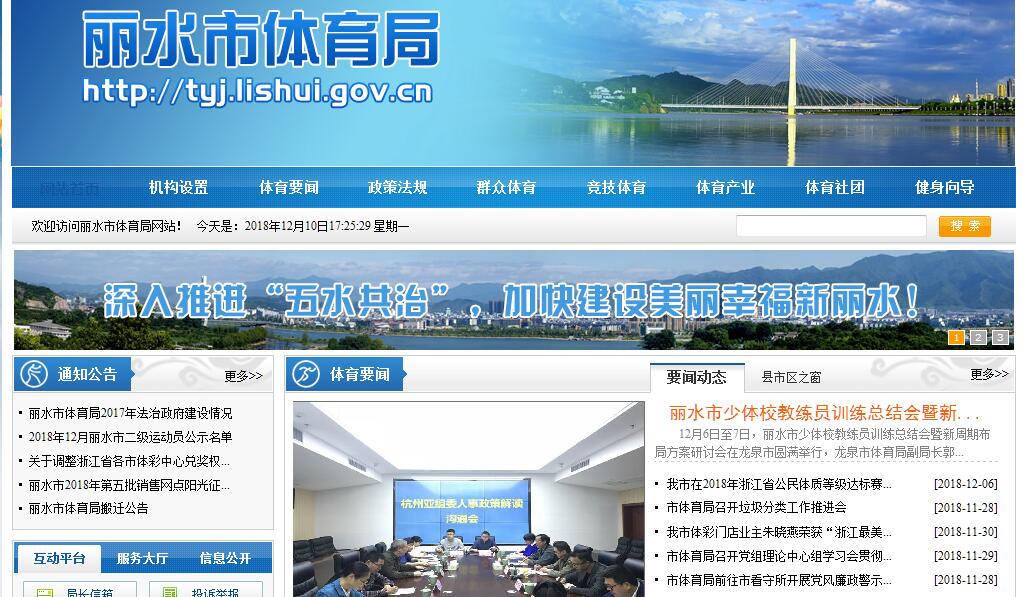 | 网站简介: 丽水市体育局主要职责:(一)贯彻执行党和国家关于体育工作的方针政策和法律法规。(二)研究、指导全市体育事业体制改革,编制体育事业发展规划,加强体育事业人才队伍建设,协调区域性体育发展。(三)指导落实全民健身计划纲要,开展群众体育活动,组织指导具有示范性的重大体育活动;实施国家体育锻炼标准,开展国民体质检测。(四)统筹规划竞技体育发展,研究全市体育运动项目设置与布局,并组织落实;组织全市各项体育赛事和省以上各体育运动项目的参赛工作;培养输送体育后备人才,承担莲都区青少年业余训练工作。(五)研究制订全市体育产业发展规划和体育产业政策,培育、发展体育产业;组织管理全市体育彩票销售。(六)负责全市体育市场的行政执法;研究制订全市体育市场的政策和发展规划。(七)协同有关部门规划、协调体育设施布局,负责市本级及指导全市体育设施建设及管理;加强对体育固定资产的管理和监督。(八)负责全市体育社团的资格审查,依法管理健身气功。(九)组织指导全市体育科学研究工作和体育宣传工作;组织开展对外体育交流和合作。(十)承办市政府、上级体育部门交办的其他事项。 |