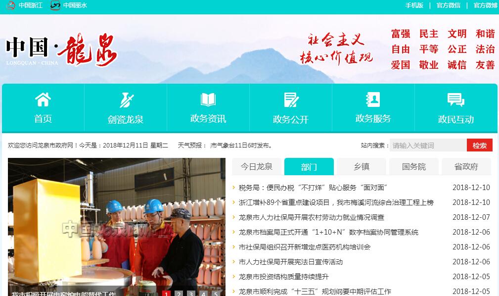 龙泉市位于浙江省西南部浙闽赣边境,素有“瓯婺八闽通衢”“驿马要道,商旅咽喉”之称和“处州十县好龙泉”的美誉。龙泉于唐乾元二年(公元759年)置县,1990年12月撤县设市,全市面积3059平方公里,辖4个街道、8个镇、7个乡,人口29万人。龙泉是生态高地。龙泉是国家历史文化名城、国家级生态示范区、国家森林城市、国家园林城市、国家重点生态功能区、浙江省生态市和环保模范城市。全市森林覆盖率高达84.2%,空气负氧离子浓度最高达12万个/立方厘米,其中城区4860个,境内凤阳山国家级自然保护区气候宜人,生态景观迷人,其主峰黄茅尖海拔1929米,为长三角第一高峰。创成国家卫生城市、省“清三河”达标县(市),两夺“五水共治”大禹鼎。2017年,空气质量优良率达到99.7%,PM2.5年均值23微克每立方米,连续三年蝉联全省第一。好生态成就健康长寿,全市80至89岁的老人9120位,长寿率为3146/10万;90至99岁的老人1069位,长寿率为368.8/10万;百岁以上老人27位,百岁长寿率为9.3/10万,3项指标均高出“世界长寿之乡”国际标准。龙泉是“非遗”宝地。龙泉是中国青瓷之都和宝剑之邦、国家历史文化名城、国家文化先进市。龙泉因剑得名,春秋时欧冶子在龙泉铸就三柄剑,用其中一柄名为“龙渊”的剑作为地名,后因避讳唐高祖李渊,改称龙泉。龙泉凭瓷生辉,龙泉青瓷始于三国两晋,盛于宋元,中兴于当代,以“清澈如秋空、宁静似深海”的哥、弟窑瓷器享誉海内外,龙泉“哥窑”与著名的官、汝、定、钧并称宋代五大名窑。从宋代开始,龙泉青瓷以主角的身份,参与开拓了漫长的世界“海上陶瓷之路”,使龙泉成为“国家级出口基地”,成为“海上丝绸之路”重要起始地。2006年,龙泉青瓷传统烧制技艺、龙泉宝剑锻制技艺双双成为首批国家级非物质文化遗产代表作;2009年,龙泉青瓷传统烧制技艺入选“人类非物质文化遗产代表作名录”,成为全球陶瓷类迄今为止唯一的“人类非遗”。2016年,中国青瓷小镇被列为省“十大示范特色小镇”和国家住建部第一批中国特色小镇,龙泉宝剑小镇列入省特色小镇创建名单。2017年,创成大窑龙泉窑国家考古遗址公园,获评中国青瓷公园,龙泉青瓷作品连续四次入选世界互联网大会,在中国嘉德拍卖行成功首拍龙泉青瓷。龙泉是人文圣地。龙泉人杰地灵,是不可多得的“进士县”,宋朝天圣至咸淳251年间,龙泉一县就出进士248名;“春色满园关不住,一枝红杏出墙来”诗句出自龙泉岩后村叶绍翁;宋代永嘉学派主要代表和集大成者叶适为龙泉人;何澹被称为“香菇文化之父”。龙泉是平安福地。2004年以来,龙泉市委、市政府积极响应习近平总书记在浙江工作期间作出的建设“平安浙江”的战略部署,持之以恒推进平安龙泉建设,平安建设花开满园、硕果累累。被中央综治委授予2009-2012年度“全国平安建设先进市”荣誉称号,连续12年被浙江省委省政府命名为“平安市”,群众安全感满意率均高于全省和丽水平均水平。2017年3月,龙泉以全省第一的成绩夺得“平安金鼎”,跨入全省乃至全国最平安城市行列。2017年,龙泉实现国内生产总值128.3亿元,同比增长7.1%;社会消费品零售总额60亿元,同比增长14.5%;财政总收入12.8亿元,同比增长13.3%,其中一般公共预算收入8.5亿元,增长11.7%;城镇、农村居民人均可支配收入分别达40548元、19282元,同比分别增长8.4%和10.2%。今后一个时期,龙泉将践行忠诚干净担当,勇立绿色发展潮头,全域打造最美“大花园”,积极投身浙江(丽水)绿色发展综合改革创新区建设,不断增强市域综合实力和竞争力,高质量建设“生态更优、实力更强、城乡更美、百姓更富、文化更兴、社会文明程度更高”的新时代美丽幸福好龙泉,勇当绿色发展的探路者和模范生,确保与全省同步实现“两个高水平”。