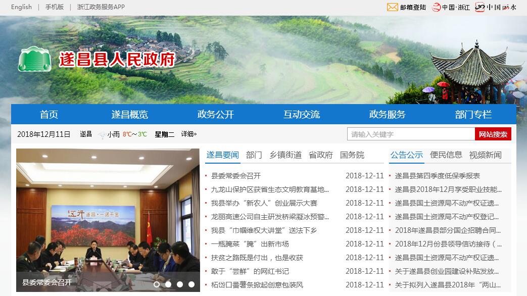 遂昌县隶属于浙江省丽水市,位于浙江省西南部,钱塘江、瓯江上游,东倚武义、松阳,南邻龙泉,西接江山和福建浦城,北与衢江、龙游、婺城相连。全县总面积2510平方公里,总人口22.74万,辖9镇11乡,390个行政村,7个城市社区。县人民政府驻地妙高街道。遂昌古称仙县,山清水秀,自然和人文景观交相辉映,旅游资源丰富,先后获中国最佳生态旅游县、中国旅游文化示范地、浙江省十大生态旅游名城、浙江省旅游经济强县等称号。有国家级自然保护区1处、森林公园1处、矿山公园1处,国家AAAA级景区4处,省级红色旅游经典景区1处。金矿、温泉、竹炭博物馆是遂昌旅游的亮点。遂昌生态环境优越,全县森林覆盖率82.3%,居浙江省前列。拥有华东地区几近唯一的原始森林——九龙山国家级自然保护区和全国惟一以县级命名的森林公园——遂昌国家森林公园。县域水质优良,出境水质常年达Ⅱ类以上。境内地热资源丰富,湖山温泉单井日出水量全省第一。全县负氧离子每立方厘米含量达9260个,高出世界清新空气标准6倍以上。“山也清,水也清,人在山阴道上行,春云处处生”,400年前汤显祖笔下的诗句正是遂昌原生态环境的生动写照。据《2013年浙江省生态文明建设评价结果报告》显示,生态文明建设综合评价结果总指数为105.26,位列全省第五。2018年10月,遂昌县入选2018年全国绿色发展百强县市。2018年11月20日,入选第二批国家生态文明建设示范市县初选名单。