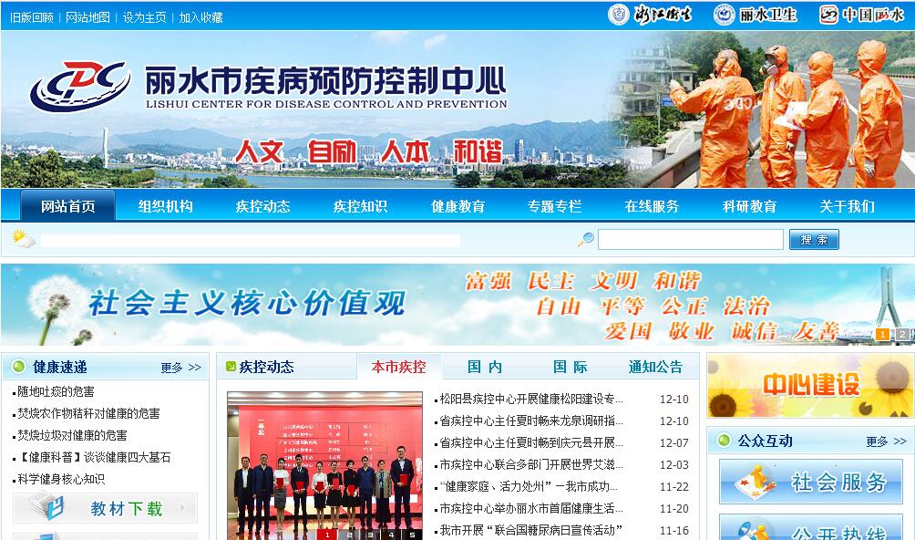 丽水市疾病预防控制中心是于2001年8月20日在原丽水市卫生防疫站基础上组建而成的,是政府举办的实施疾病预防控制与公共卫生技术管理和服务的公益事业单位,是全市疾病预防控制、卫生检验检测、健康教育、科研培训等业务技术的指导中心、科技研究中心、信息管理中心、人才培训中心。2004年10月,为加快城市公共卫生突发事件应急机制,完善疾病预防控制体制,丽水市编委发文,把丽水市疾控中心机构升格为副县(处)级事业单位。丽水市疾病预防控制中心现有职工89人,其中高级职称15人,中级职称31人。中心下设11个科室,即:办公室、总务财务科、传染病预防与控制科、突发公共卫生事件应急处置科、重点传染病预防与控制科、健康危害因素监测与控制科、地方病与慢性非传染性疾病控制科、健康教育科、检验科、消杀与病媒生物监测科、莲都区分中心。中心拥有原子吸收分光光度计、气相色谱、PRC测定仪、生物安全柜、酶标仪等仪器设备;建有艾滋病确证实验室、国家P2级实验室、理化实验室和其它微生物实验室,并于2000年通过计量认证。丽水市疾病预防控制中心其主要职责有:1、对影响人群生存环境卫生质量及生命质量的危险因素进行食品、职业、环境、放射、学校卫生等卫生监测;对传染病、地方病、寄生虫病、慢性非传染性疾病、职业病、公害病、学生常见病及意外伤害、中毒等发生、分布和发展的规律流行病学监测,并制定预防控制对策。2、为拟订与疾病预防控制和公共卫生相关的法律、法规、规章、政策、标准、规划等提供科学依据,为卫生行政部门提供决策咨询。3、拟订并实施疾病预防控制工作方案,对方案实施进行质量和效果评估。4、对传染病的发生流行和中毒、污染事件进行调查处理,为救灾防病和解决重大公共卫生问题提供技术支持。5、实施预防接种,负责预防用生物制品的使用与管理。6、负责人员培训,指导技术规范和技术措施的实施;承担爱国卫生运动中与疾病预防控制有关的技术指导。7、开展健康教育与健康促进,参与社区卫生服务工作,促进社会健康环境的建立和人群健康行为的形成。8、承担疾病预防控制及有关公共卫生信息的报告、管理和预测、预报,为疾病预防控制决策提供科学依据。9、开展卫生防病检验和实验室质量控制;受卫生行政部门认定,承担卫生监督监测检验、预防性健康检查、健康相关产品的技术审核和卫生质量检验、鉴定;对新建、改建建设项目的选址、设计和竣工验收进行卫生学评价。10、进行应用性科学研究,开发和推广先进技术。11、开展对外交流与合作,引进和推广新技术、新方法。12、向社会提供相关的预防保健信息、健康咨询和预防医学诊疗等专业技术服务。13、完成卫生行政部门交付的其它任务。中心的宗旨是贯彻预防为主方针,"团结、务实、开拓、奋进",为全市人民健康服务,为全市社会发展和经济建设服务。