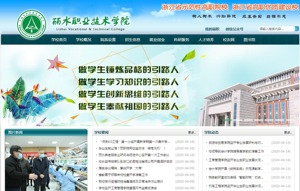 丽水职业技术学院是一所历史悠久、底蕴深厚的全日制综合性高职院校,前身是1910年处州知府萧文昭创办的处州种植学堂。2000年12月,原浙江林业学校和浙江丽水商业学校合并升格组建为丽水职业技术学院。建校以来,学校秉承“树木树人,行知并进”校训,落实立德树人根本任务,主动对接丽水区域发展战略,立足职业教育产教融合办学特色,培养敬业长技、爱岗忠企的高素质技术技能型人才。2017年4月,学校在全省50所高职院校竞争性排位中脱颖而出,顺利入选浙江省优质校建设单位,综合办学实力和核心竞争力取得了新的突破。学校占地470亩,规划用地120亩,校舍建筑面积18万平方米,资产总额4.43亿元。下设林业科技、建筑与设计、机电工程、会计、工商管理、旅游与贸易、继续教育7个二级学院,27个专业,普通全日制在校生7566人。现有教职工422人,其中专任教师301人,教授21人,副教授等副高职称教师121人。省级教学团队2支、省级教学名师3人、省级优秀教师3人,省级教坛新秀4人、省级专业带头人22人,浙江省中青年突出贡献专家、省“151”人才等共31人。现有实训中心9个,其中中央财政支持实训基地3个,省级示范性实训基地4个。校内教学实训场所总面积16.83万平方米,教学实训设备总值超过6000万元;校外基地380家,其中紧密型基地100余家。图书馆藏书60余万册,已建成技术设备较先进的校园网。学校坚持以人为本、德育为先,不断提升教育教学质量。适时开展“面向基层培养新时期护林人”的定向培养,与浙江农林大学合作举办林学(林业技术)本科专业。建成中央财政支持建设专业2个、国家林业局重点建设专业1个、省级优势专业4个、省级重点专业4个、省级特色专业8个。专业建设成果荣获国家级教学成果一等奖、二等奖共3项,省级教学成果一等奖、二等奖共6项。现有国家精品资源共享课1门,国家教学资源库课程6门,在建省级精品在线开放课程3门;主编国家级规划教材31部。学校坚持产教融合、校企合作,认真践行“乡村振兴战略”,科研社会服务工作持续向好、服务区域经济效能稳步提升。创建丽水农民学院、丽水职业教育集团、庆元食用菌学院、丽水旅游养生学院、天喜控股培训学院等,向区域主导产业派驻产业联络员、教授服务团、科技特派员,助推主导产业发展。学校科研成果获国家社科基金2个、全国教科规划教育部重点项目1个、教育部人文社科基金1个,省自然科学基金、省科技厅课题、省哲社规课题等省级以上项目34项。以农民学院为平台,面向全国、特别是中西部地区推广丽水作为“两山理论”探路者、模范生的实践经验。学校坚持以学生为中心的发展思想,以“金扣子”育人工程为抓手,突出强调社会主义核心价值观育人功能,学风建设彰显新活力。以百周成长记录为载体,扎实推进“双百双进”“一路文明”等活动。深入推进校园文化建设,改善校园空间环境,打造思想政治教育“最美校园”。涌现出一批先进典型,如中国大学生十大年度人物、第十届中国青年志愿者优秀个人、中国大学生自强之星、全国优秀共青团员、全国优秀团干部、浙江省道德模范、浙江省十佳大学生、浙江省十大优秀青年等。站在新的历史方位,学校将始终坚持以习近平新时代中国特色社会主义思想为行动指南,以五大发展理念为指导,明目标、树标杆、争先进位大赶超,同心戮力,砥砺前行,着力推进教育教学改革创新,切实提升人才培养质量,为全面建成小康社会、实现中华民族伟大复兴中国梦贡献更多力量。