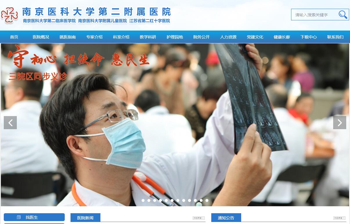 南京医科大学第二附属医院,暨江苏省第二红十字医院、南京医科大学第二临床医学院,创建于1951年,至今已有68年历史。医院是江苏省卫生计生委直属的三级甲等综合医院,担负着医疗、教学、科研、公益等重要任务。医院有两个院区(姜家园院区和萨家湾院区),占地面积共58亩,建筑面积9万平方米,固定资产8.45亿元,其中专业设备5.26亿元;编制床位数1600张,实际开放床位数1520张,开放病区45个,职工2300余人。医院年门急诊量约130万人次,年出院病人数约6万人次,手术量约2.6万台次。现有临床科室37个,其中省级临床重点专科15个(含建设单位),分别为消化内科、小儿内科、肾脏内科、妇产科、老年医学科、神经内科、内分泌科、肿瘤科、泌尿外科、眼科、耳鼻咽喉科、心血管内科、普外科(建设单位)、医学影像科(建设单位)、呼吸内科(建设单位)。消化医学中心和肾脏病中心为江苏省“十三五科教强卫工程”医学重点学科,并且两个科室都进入《2018年中国医院科技值(STEM)排行榜》百强。医院还是国家卫生计生委(原卫生部)全科医师培训基地、消化内镜诊疗培训基地、妇科四级腔镜诊疗培训基地、临床药师培训基地、住院医师规范化培训基地(24个专业)。医院现有医技科室10个,能够满足全身各个器官的诊断,开展各种类型的化验诊断。医院拥有一大批高层次人次,其中高级职称412人,享受政府特殊津贴专家7人,省突出贡献中青年专家2人,省双创团队1个,省双创人才2人,省特聘教授、医学专家6人,“333工程”第二层次培养对象5人、第三层次培养对象38人,省“六大人才高峰”培养对象46人,省卫计委“十三五科教强卫工程”医学创新团队4个、医学重点人才5人、青年医学人才19人。医院是国家药监总局和国家卫生计生委批准的国家药物临床试验机构(药物临床试验专业12个)。医院有南京医科大学校级重点实验室3个(肾脏病学、整合肠病学、衰老与相关疾病研究)。近三年,医院共获得科研项目239项,其中省级以上课题57项,国家自然科学基金32项;发表SCI论文320篇;获得中华医学科技奖三等奖1项,江苏省科学技术二等奖1项、三等奖1项,江苏医学科技奖1项,江苏省妇幼健康引进新技术奖1项,江苏省教育教学与研究成果奖1项,江苏省医学新技术引进奖9项,江苏中医药科技奖1项,江苏省肿瘤医学科技奖一等奖1项,南京市政府科技进步二等奖1项。儿科学(16位)、肾脏病学(21位)、心血管病学(57位)、消化病学(61位)、呼吸病学(75位)、普通外科学(84位)、肿瘤学(89位)入围2017年度《中国医院科技影响力排行榜》专科全国百强。2018年度Nature Index发布的自然指数排行榜第45位。作为南京医科大学直属的附属医院、南京医科大学第二临床医学院,医院有4个学系、11个教研室,拥有教授18位、副教授52位、博士生导师22位、硕士生导师95位。目前在院学习的本科生和研究生(含博士)600余人,年理论课时数4000余学时。医院始终秉承“敬佑生命、救死扶伤、甘于奉献、大爱无疆”的医院精神,践行“至精至诚、至善至爱”的宗旨,坚持“以病人为中心”,深化医改、内抓质量、外树形象,不断提升医疗服务、教育教学、科学研究、文化传承与创新的能力,努力打造一所“国内知名、省内一流、百姓信赖”的大型综合医院,为“健康江苏”“健康中国”贡献力量。