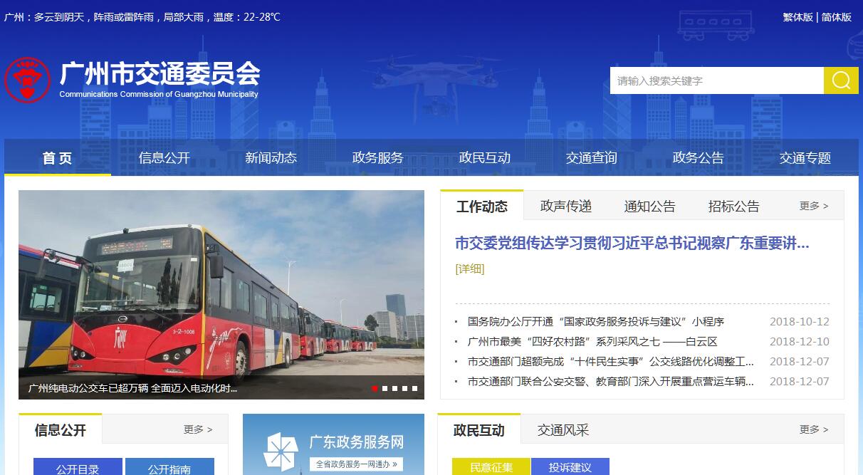 广州市交通委员会主要职责:1.贯彻执行国家、省、市有关交通工作的方针政策和法律法规,起草有关地方性法规、规章草案和政策措施并监督实施,拟订交通行业发展战略和规划、物流业具体发展规划并组织实施,指导交通行业有关体制改革工作。2.负责涉及综合运输体系的规划协调工作,参与本市城市总体规划、控制性详细规划中有关交通规划研究,组织编制综合运输体系规划及相关专项规划并组织实施。3.负责道路运输、道路运输服务业、公共汽车电车客运、出租汽车客运、轮渡、停车场、汽车租赁、物流业的监督管理和公路路政管理,负责城市轨道交通的运营管理,组织制定相关政策、运营规范并监督实施,监督执行相关准入制度、技术标准,组织实施交通综合行政执法工作。4.负责组织实施公路建设;负责公路养护维修行业的监督管理,承担由市本级负责的公路养护维修的组织实施工作;负责公共汽车电车客运服务设施、道路运输站(场)的监督管理。5.牵头组织全市道路交通畅通保障工作,建立大中型城建项目及配套设施交通影响评估制度并组织审查。6.组织拟订近期交通建设规划并协调组织实施;统筹协调交通运输网络建设,组织指导道路运输站(场)、公共汽车电车客运服务设施等交通基础设施建设。7.依权限对交通基本建设资金进行监督管理,统筹编制有关市政公用设施维护计划、交通改善工程资金计划并监督实施,按上级交通主管部门的要求统筹编报公路运输枢纽、港航设施建设等有关项目交通运输年度固定资产投资计划,参与编制交通年度建设计划,协调或参与交通建设资金的筹集。8.负责公路、城市道路收费管理及联网收费的组织协调和监管工作,负责有关交通基础设施特许经营项目投资主体招标投标的组织协调和监管,参与拟订交通行业相关收费标准并监督实施。9.负责组织协调广州地区多种运输方式的衔接,组织实施重点物资和紧急客货运输、重大节假日期间的旅客运输,承担铁路、民航、港口、邮政等综合运输的协调工作。10.组织协调制定全市交通行业科技政策、重大科技项目开发、环境保护和节能减排工作,组织交通专业技术职称评审工作,参与交通行业无线电通信管理的相关工作,牵头协调广州电子口岸建设工作。11.负责全市交通行业安全生产监管和应急管理,参与调查处理交通行业重特大安全事故,协调有关部门做好水上交通安全监管工作。12.负责本市中小客车指标调控管理工作。13.受市政府委托管理广州地区交通战备工作。14.承办市委、市政府和上级交通主管部门交办的其他事项。