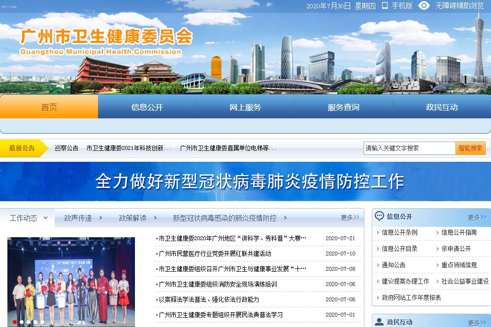 广州市卫生健康委员会主要职责:(一)贯彻执行国家和省、市卫生健康工作法律法规和方针政策,拟订我市卫生健康事业发展的地方性法规、规章草案和政策、规划,制定并实施有关标准和技术规范。统筹规划卫生健康资源配置,指导区域卫生健康规划的编制和实施。制定并组织实施推进卫生健康基本公共服务均等化、普惠化、便捷化和公共资源向基层延伸等政策措施。(二)协调推进我市深化医药卫生体制改革,研究提出深化医药卫生体制改革重大方针、政策、措施的建议。组织深化公立医院综合改革,推进管办分离,健全现代医院管理制度,制订并组织实施推动卫生健康公共服务提供主体多元化、提供方式多样化的政策措施,提出医疗服务和药品价格政策的建议。(三)制定并组织落实重大疾病防治规划以及严重危害人民健康公共卫生问题的干预措施,组织实施免疫规划。负责卫生应急工作,组织指导突发公共卫生事件的预防控制和各类突发公共事件的医疗卫生救援。(四)负责职责范围内的职业卫生、放射卫生、环境卫生、学校卫生、公共场所卫生、饮用水卫生等公共卫生的监督管理,负责传染病防治监督,健全卫生健康综合监督体系。组织开展爱国卫生运动。(五)负责医疗机构、医疗服务行业管理办法的监督实施,建立医疗机构、医疗服务评价和监督管理体系。制定并组织实施医疗服务规范、标准和卫生健康专业技术人员执业规则、服务规范。会同有关部门制定并实施卫生健康专业技术人员资格标准。负责市卫生健康委系统安全生产相关工作,指导行业信访维稳工作。(六)负责拟订并协调落实中医药事业发展规划和政策,推动中医药强市建设。指导市计划生育协会的业务工作。(七)组织实施国家基本药物制度、药物政策,开展药品使用监测、临床综合评价和短缺药品预警,提出基本药物价格政策的建议。组织开展食品安全风险监测评估。(八)指导区卫生健康工作。指导基层医疗卫生、妇幼健康服务体系和全科医生队伍建设。推进卫生健康科技创新发展。(九)负责计划生育管理和服务工作,开展人口监测预警,研究提出人口与家庭发展相关政策建议,完善计划生育政策。(十)组织拟订并协调落实应对人口老龄化政策措施,负责推进老年健康服务体系建设和医养结合工作。(十一)负责卫生健康宣传、教育和健康促进等工作,依法组织实施统计调查(含广州地区部属、省直属单位及驻穗部队)。组织指导交流合作与援外工作,开展与港澳台的交流与合作。(十二)负责拟订并协调落实卫生健康人才发展规划和政策,推动高素质专业化卫生健康人才队伍建设。(十三)负责保健对象的医疗保健工作,负责市重大活动与重要会议的医疗卫生保障工作。(十四)完成市委、市政府和上级相关部门交办的其他任务。