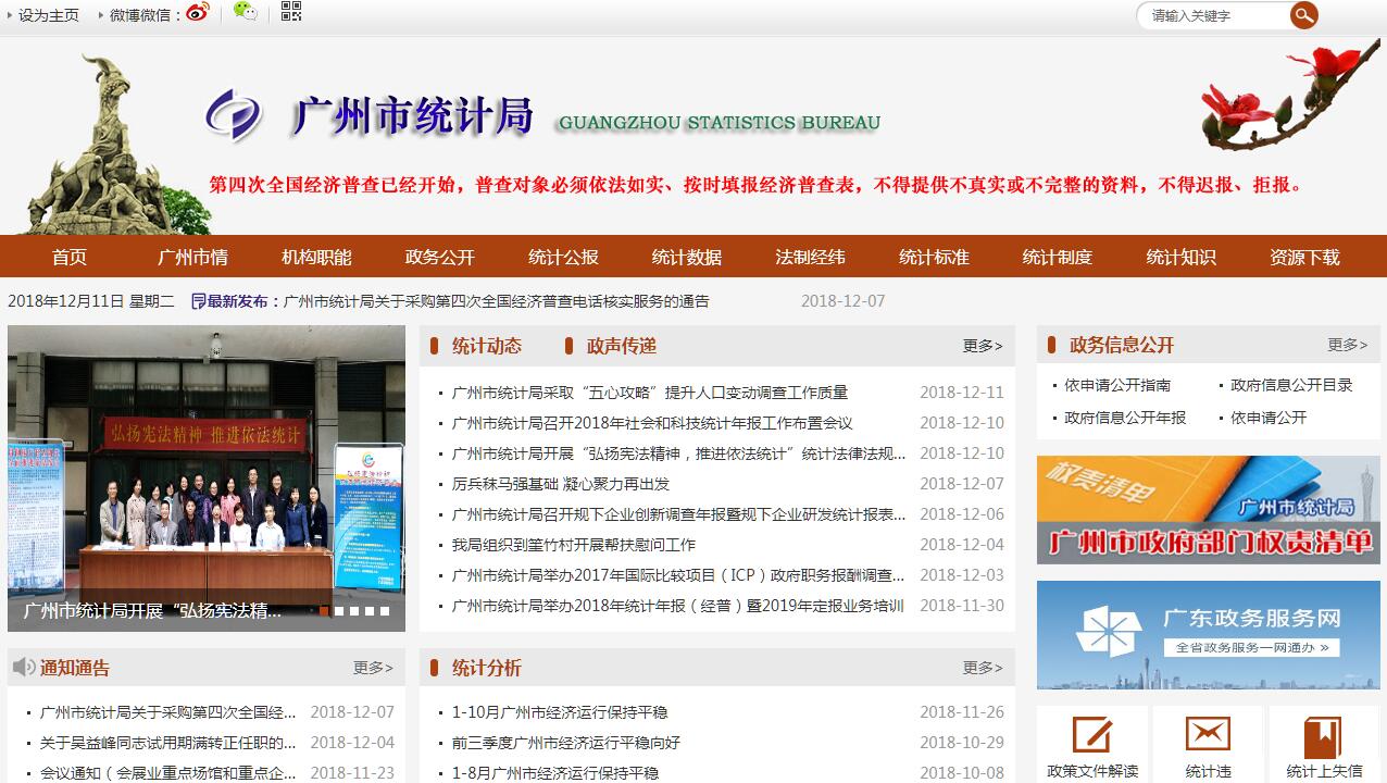 广州市统计局主要职责:(一)贯彻执行国家、省、市有关统计工作的方针政策、方法制度和法律法规,起草有关地方性法规、规章草案,拟订统计现代化建设规划和统计调查计划并组织实施;承担组织和协调全市统计工作,确保统计数据真实、准确、及时的责任;监督检查统计法律、法规和制度的实施,依法查处统计违法行为。(二)拟订地方统计报表制度,组织实施国民经济核算制度和投入产出调查,核算市及区、县级市生产总值,汇编提供国民经济核算资料,监督管理各区、县级市国民经济核算工作。(三)会同有关部门拟订重大市情市力普查计划、方案,组织实施人口、经济、农业等重大市情市力普查,汇总、整理和提供有关市情市力方面的统计数据。(四)组织实施农林牧渔业、工业、建筑业及房地产业、批发和零售业、住宿和餐饮业等统计调查,收集、汇总、整理和提供有关调查的统计数据,综合整理和提供地质勘查、旅游、对外经济、交通运输、邮政、教育、卫生、社会保障、公用事业等基本统计数据。(五)组织实施能源、投资、科技、人口、劳动力、社会发展基本情况等统计调查,收集、汇总、整理和提供有关调查的统计数据。(六)组织市各部门和各区、县级市的经济、社会、科技和资源环境统计调查,依法检查、审定、管理、公布、出版基本统计资料,组织建立健全统计信息发布制度,定期向社会发布国民经济和社会发展情况的统计公报。(七)对国民经济、社会发展等情况进行统计分析、统计预测和统计监督,向市委、市政府及有关部门提供统计信息和统计咨询建议。(八)依法审批部门统计调查项目,指导专业统计基础工作、统计基层业务基础建设,组织建立和健全统计数据质量审核、监控和评估制度,开展对重要统计数据的审核、监控和评估。(九)依法协助管理区、县级市统计部门主要负责人,组织指导统计教育、统计干部培训、统计科学研究与统计国际交流等工作,会同有关部门组织管理统计专业资格考试、职务评聘和从业资格认定工作,会同有关部门监督管理本系统事业单位和区、县级市政府统计部门由中央、省、市财政提供的统计经费和专项基本建设投资。(十)组织建立并管理统计信息自动化系统和统计数据系统,建立并管理宏观经济数据库,指导各区、县级市和各部门统计数据库和网络的基本标准和运行规则的实施工作,指导统计信息化系统建设。(十一)承办市委、市政府和上级统计部门交办的其他事项。