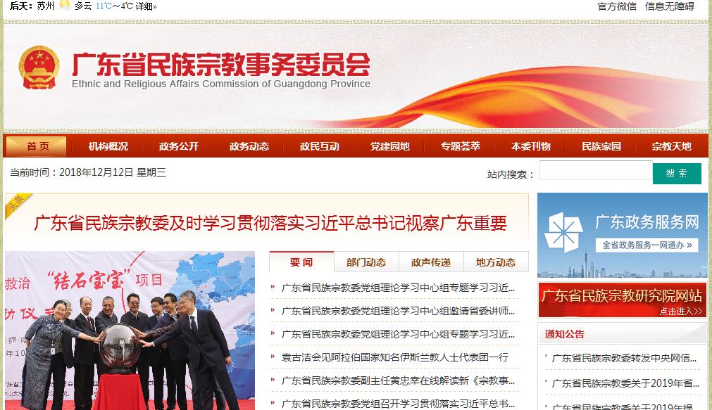 广东省民族宗教委是主管民族宗教事务的广东省人民政府组成部门。其主要职责:(1)贯彻执行中央和省有关民族、宗教工作的方针政策和法律法规,起草有关地方性法规、规章草案和政策措施,并组织实施和督促检查。(2)负责协调推动有关部门履行民族、宗教工作相关职责,促进民族政策在经济发展和社会事业有关领域的实施。(3)研究提出协调民族、宗教关系的工作建议,协调处理民族、宗教关系中的重大事项,参与协调涉及民族、宗教因素的社会维稳工作,保障少数民族和宗教界的合法权益,维护民族、宗教领域的和谐稳定。(4)负责组织指导民族、宗教政策和法律法规的宣传教育工作,组织协调民族地区和城市涉及民族因素的重大庆典活动,依法履行宗教事务管理职责,依法保护公民宗教信仰自由和正常的宗教活动。(5)指导民族、宗教团体依法依章开展活动,支持民族、宗教团体加强自身建设,帮助宗教团体办好宗教院校,推动民族、宗教团体开展爱国主义、社会主义、拥护祖国统一和民族团结教育,办理民族、宗教团体需政府帮助解决或协调的有关事务。(6)依法管理民族、宗教方面的涉外事务,协调民族、宗教工作的对外交流与合作,参与涉及民族、宗教事务的对外宣传工作,组织指导民族、宗教团体开展对外友好交往。(7)参与拟订少数民族人才队伍建设规划,协助有关部门做好少数民族干部的培养、教育和使用工作,帮助宗教团体做好宗教人士的培养教育工作。(8)承办省委、省政府和国家民族事务委员会、国家宗教局交办的其他事项。