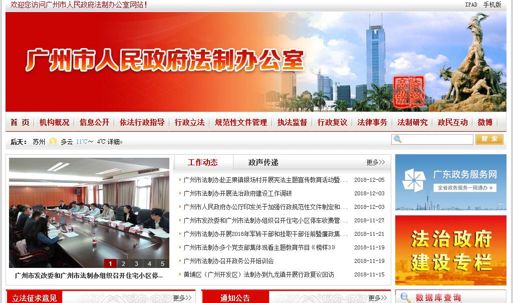 广州市人民政府法制办公室主要职责:(一)贯彻执行国家、省有关法制工作的方针政策,督促指导全市依法行政工作,调查研究依法行政工作中出现的新情况、新问题,提出推进依法行政的措施和建议。(二)承担统筹规划市政府立法工作的责任。组织编制并实施中长期立法规划和年度立法计划,组织起草、审核、修改地方性法规、市政府规章草案,负责市政府规章的备案、解释工作,承办国家和省有关法律、法规和规章草案征求意见工作。(三)承担行政执法监督的责任。建立、完善和组织实施行政执法监督制度,负责对本市行政机关实施行政许可进行监督、指导,协调指导相对集中行政处罚权工作,组织本市行政执法人员的培训,负责《 行政执法证》 发放工作的协调和监督,监督使用《 行政执法证》,负责行政执法投诉举报的处理工作。(四)负责市政府规范性文件草案的审核,承担市政府部门规范性文件的审查以及各区、县级市政府行政规范性文件的备案及合法性审查责任,办理公民、法人和其他组织对规章、规范性文件提出的合法性审查申请事项,监督检查全市规范性文件的制定和管理情况。(五)组织实施政府规章立法后的评估工作,会同有关部门组织实施行政执法评议考核工作,协调部门之间在有关法律、法规、规章和行政规范性文件实施中的矛盾和争议,承办市政府实施的行政处罚等执法事项。(六)办理向市政府申请的行政复议、行政赔偿案件,代理市政府行政应诉事务,监督、指导全市行政复议、行政应诉和行政赔偿工作。(七)负责市政府法律顾问事务。承办币政府重大决策、重要行政措施发布前的合法性审查及市领导交办的法律事务,代理市政府民事诉讼事务。(八)组织清理、编纂政府规章和行政规范性文件,翻译、审定政府规章外文版本,开展政府法制理论、政府法制工作研究和宣传及对外法制业务交流,指导区、县级市政府和市政府工作部门及其法制机构的法制建设。(九)承办市委、市政府和上级法制部门交办的其他事项。
