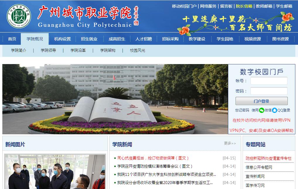 广州城市职业学院是2005年3月经广东省人民政府批准、国家教育部备案,由广州市人民政府举办的高等职业院校。学院于2005年9月揭牌成立。2009年5月,广州市政府批准学院加挂“广州社区学院”牌子,成为广州首家社区学院。学院的办学理念是:“质量立校、人才强校、文化塑校、特色兴校”。办学定位是:立足广州,服务城市发展;以高等职业教育为主,积极拓展社区教育;坚持职业教育规律,坚持文化塑校,坚持内涵发展,努力把学院建设成为以岭南文化与时代精神相互交融为特征的高级技术技能人才培养基地、应用技术转化平台、社区教育与服务示范中心和市民终身学习园地。学院发展的四大办学优势是:北上广一线城市的中心区、国家重要中心城市的风景区、文理工艺专业兼有的综合区、毕业生高就业率的示范区。学院办学历史最早可以追溯至1962年,50多年来为社会各界培养了30多万人才,受到社会的广泛好评。2009年12月,学院以优异的成绩通过教育部人才培养工作评估。2013年11月,被广东省教育厅确立为广东省示范性建设高职院校。到2020年,争取建设成为广东省一流水平的高职院校。学院位于国家重要中心城市广州,现有5个校区。广园南校区、广园北校区坐落在风景秀丽的白云山下、麓湖之畔,海珠、滨江及越秀3个校区分布在广州中心市区。学院建有多功能的现代化图书馆,教学大楼、实训大楼、宿舍楼、学生活动中心、室内外体育场馆等设施一应俱全。数字化校园整体建设和应用水平在全省高职院校中位居前列。目前,学院面向广东、安徽、福建、江西、湖南、四川、广西、山西、内蒙古、河南、贵州、云南、甘肃、河北等14个省、自治区招生,第一志愿上线率和新生报到率连年保持较高水平。学院围绕服务广州城市建设与城市服务二大板块开设了10个专业群,设有信息技术系、机电工程系、商贸系、财会金融系、旅游系、公共管理系、艺术设计系、城市建设工程系、食品系、应用外语系、社科部、国学院、继续教育中心等13个教学单位,高职教育研究所和社区教育研究中心等科研机构。学院拥有一支结构合理的专兼结合高素质教师队伍。现有教职工630人,其中专任教师418人,具有高级职称的133人,双师素质教师340人。学院不断创新办学体制机制,改革人才培养模式,加强内涵建设,不断提高人才培养质量。建有省市级示范专业29个,省市级精品课程37门,获得一大批省、市级教学成果奖和教学科研课题;实施专业与课程体系改革,建立基于职业岗位工作过程的职业课程体系,全面强化学生职业能力培养。着力推动创新创业教育与专业教育深度融合,实施面向全体学生的创新创业教育。学生在国家、省级和市级技能竞赛屡获优异成绩。毕业生双证书获取率达到97%,毕业生就业率连年超过98%,位居全省普通高校前列,毕业生社会评价满意率超过95%。学院坚持产教融合、校企合作、协同育人。学院与韶关学院等本科院校合作开展“2+2”、“3+2”协同育人,与知名企业开展现代学徒制人才培养。目前,学院拥有萝岗食品学院、远望谷物联网等省级协同育人平台,食品工程特色学院、广州城市建设特色学院等广州市特色专业学院,食品工程产业学院、物联网产业学院等广州市产教融合专业学院。学院形成了完备的校内外实训实习基地体系,拥有中央财政支持实训基地2个、省级重点实训基地8个、市级示范性实训基地9个,与企业合作共建广州城市职业学院萝岗食品学院、广州城市职业学院远望谷物联网技术学院、金衡会计学院和广州城市建设职业教育集团等办学实体。学院注重培育校本文化根基,形成了“思诚贵和”的校风和“乐学善用”的学风。创建了国内高职院校中首个国学院,将社会主义核心价值观融入人才培养全过程,将中华优秀传统文化精髓与职业道德、职业能力和职业精神培育有机结合,全面提升学生人文素质,造就既具有娴熟的职业技能,又拥有良好品德与和谐人格的高素质技术技能人才。学院发扬社区教育优良传统,构建以政府为主导、学院为主体、社区为中心、企业参与的社区教育与服务网络和工作体系,增强学院的社区教育与服务能力。目前,广州市依托我院成立了“广州社区教育与服务指导中心”,彰显广州社区学院的功能。学院坚持开放办学,加强国内外合作与交流,提升办学的国际化水平。目前已与德国、英国、日本、马来西亚、台湾等多个国(境)外、地区文化教育机构建立校际合作关系、开展合作办学,其中与马来西亚城市大学合作共建广州城市职业学院吉隆坡本科校区、广州城市职业学院“中马国际学院”暨马来西亚城市大学广州校区。选派大批骨干教师赴国(境)外培训学习,提高教师职业教育能力。遴选学生赴德国F+U萨克森培训中心、马来西亚北方大学、沙巴大学进修和交流,为学生提供了更高层次的国际教育交流与出国深造平台,目前已有11批学生学成归来。今天,学院正全面贯彻党的十九大精神,以习近平新时代中国特色社会主义思想为指导,深入贯彻习近平总书记对广东重要指示批示精神,服务“五位一体”总体布局和“四个全面”战略布局,贯彻落实新发展理念,坚持“立人立业,立德立志;教师为根,学生为本”的治校理念,深入实施“特色学院战略”,优化整合资源,深化体制机制改革,强化内涵建设,打造专业品