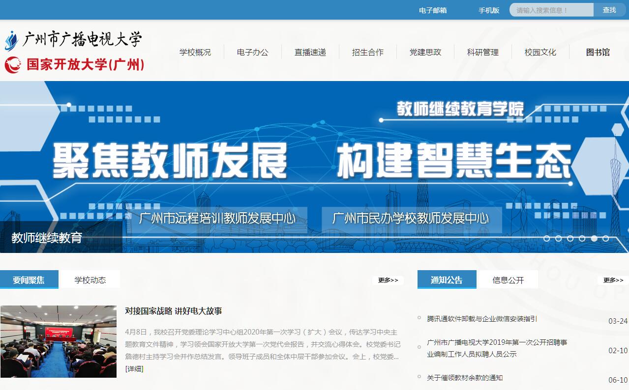 广州市广播电视大学创办于1961年,是一所以现代信息技术为支撑,非学历教育与学历教育并举,实施远程开放教育的新型高等学校。学校遵循“有教无类”的办学理念,以增强自身发展和服务社会能力为宗旨,围绕为中心城市经济社会建设培养应用型人才为目标,积极开展非学历继续教育和学历继续教育。建校以来,共培养本专科毕业生40余万人,各类培训累计超过800万人次,为推进广州高等教育大众化进程和培养社会亟需专门型人才作出了重要贡献。学校被教育部授予“国家数字化学习资源中心广州中心”、“终身学习公共服务平台建设示范基地”,“国培计划”远程培训机构,国家教育体制改革试点项目“推进广州学习型社会建设”的主体实施单位。广州电大已成为广州市民“家门口”的大学,赢得了社会各界的广泛赞誉。学校始终立足广州、服务广州,紧紧围绕广州经济社会发展和转型升级全局,狠抓内涵建设,在人才培养模式、教学模式和管理模式等方面进行积极探索,创造了以人为本、个性化的网络学习环境,建成了广州市覆盖面最广、学习人数最多的现代远程教育网络,为促进教育公平、优化我市高等教育结构和层次布局作出了重要贡献。广州电大系统目前在读各类本专科学生8万余人,非学历继续教育年培训量80万人次,在全市各区、各行业、企业单位建立了50余所分校,办学规模与质量在全国城市电大中名列前茅。近年来,学校立足向开放大学转型发展的定位,通过加强学习环境建设、教学团队建设、特色专业建设、课程与资源建设、实践基地建设、支持服务体系建设,保持了教学基本建设与学校办学事业的协调发展。学校受广州市委组织部委托开展“羊城村官上大学”工程,全市8个区委组织部、电大共同组织开展农村基层干部学历教育,已有近5000名基层农村干部成为大学生。承担教育部、全国总工会农民工“求学圆梦行动”计划,至2017年受惠企业职工已达9000余人学校主动承担构建广州终身教育体系和推进广州学习型城市建设的重任,积极开展社会公共教育支持服务实践,加速发展“互联网+”教育,打造广州区域网络远程教育品牌,为广州构建“人人皆学、时时能学、处处可学”的学习型社会作出了重要贡献。作为教育部“中小学教师国家级培训计划”远程培训机构,已先后承担9省、市、自治区近3万人“国培”任务。同时承担广州市中小学教师继续教育每年70多万人次在线继续教育学习。在市委市政府的正确领导下,在国家开放大学、市教育局的大力支持下,学校将一如既往深入推进战略转型和开放大学建设,努力成为广州学习型城市建设的重要实体和引领广州终身教育的重要力量。