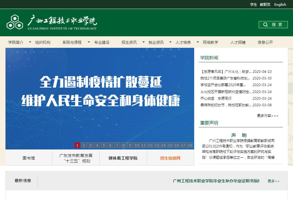 广州工程技术职业学院是经广东省人民政府批准、国家教育部备案的广州市属普通高校,创办于1964年。学院以先进的教育理念、独特的办学思路、优秀的师资队伍、优雅的校园环境、鲜明的高职特色,致力于培养具有现代竞争意识和综合职业能力、素质全面,能适应二十一世纪经济发展需要的高素质的技术技能型人才。作为一所有着五十多年历史的公办高校,近年来,在不断的改革、超越和发展中打下了稳固的基础,积累了丰富的经验,逐步形成了知识、品格、才艺、技能四元并重的办学风格。以独特的思路和新颖的做法应对竞争,谋求突破,实现了跨越式发展,形成了 “万人学校,亿元资产 ” 的强劲格局,取得了良好的经济效益和社会效益。学院现设有机电工程系、信息工程系、石化工程系、财经与管理系、外语与商贸系、餐饮与旅游管理学院、艺术与设计学院、继续教育学院等8个系(院),在校高职生人数近8000人。外加三所附属中职学校和一个培训中心,组建了以高职教育为主体、以中职教育为两翼、以技能培训为拓展平台,在校学历生规模超1.6万人,年培训超3万人次的职业教育集团。学院办学紧贴广州及珠江三角洲地区经济社会发展的需要,实施专业错位发展和人才培养模式创新,培养“有教养、有本领”的高素质技术技能型人才。毕业生总体就业率连续六年位居全省本专科院校前三名,毕业生以良好的面貌、全面的素质和过硬的能力广受用人单位好评,用人单位的满意率达100%,其中优良率达96.61%。2017年初次就业率98.81%,高于全省高校毕业平均初次就业率3.71%,位居全省普通高等学校毕业生初次就业率第一位。