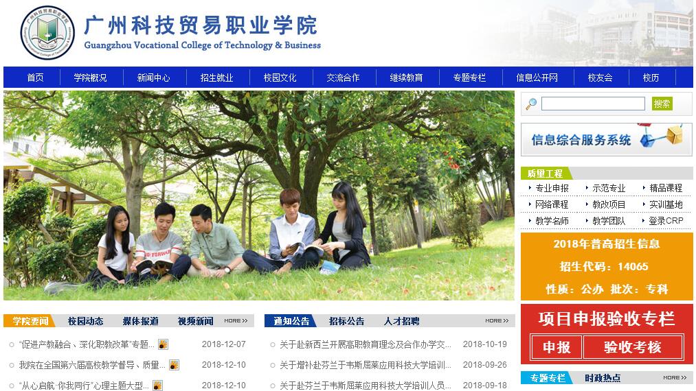 广州科技贸易职业学院由广州市科学技术协会于1984年创办,是经广东省政府批准、国家教育部备案的广州市属公办全日制普通高等职业院校。著名科学家、中国工程院院士、广州市科学技术协会名誉主席钟南山担任名誉院长。学院现有番禺校区(毗邻广州大学城)、越秀花果山校区,地理位置优越,校园环境优美。学院设有商贸学院、管理学院、信息工程学院、机电工程学院、创意设计学院、服装与艺术学院、公共课教学部、思想政治理论课教学部。全日制在校生7000余人。教职员工466人,其中专任教师334人,高级职称专任教师82人,硕士以上学位的专任教师215人,高级职称及硕士以上学位专任教师比例均位于省内高职院校前列。学院紧扣珠三角地区支柱产业,紧贴区域经济发展需求,开设了电子信息工程技术、会展策划与管理、城市轨道交通运营管理(地铁运营管理)、动漫设计与制作、物流管理、国际经济与贸易、汽车检测与维修技术、艺术设计、服装与服饰设计等27个专业,其中中央财政支持重点专业2个,省级重点建设专业6个,省级品牌建设专业2个,省级实训建设基地5个,市重点(示范)专业7个。学院大力实施创新强校工程,推进“政校行企”协同创新,深化校企合作、产教融合、工学结合的现代高职人才培养模式改革,建设校内外实训基地230多个,其中省级实训基地5个,省级教学团队1个,市级教学团队3个,省级精品课程7门。学院全面实行“专业导师制”和“五大育人工程”,全面提高学生综合能力,近三年学生参加各类职业技能大赛获国家级奖励近300余项,人才培养质量得到社会广泛认可,招生就业连续多年保持两旺,近三年毕业生初次就业率均超过98%。