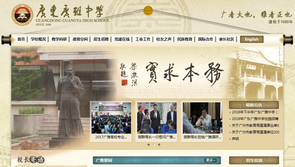 广东广雅中学是著名的重点中学,广东省首批省一级学校、国家级示范性普通高中,广东省中学唯一的省级文物保护单位。她创建于1888年,其前身是由清朝两广总督张之洞创办的广雅书院,与湖北自强学堂、两湖书院、上海南洋公学并称为当时中国四大书院。百年广雅,历尽沧桑,饱经动荡,数迁校址,几易校名。然办学宗旨一脉相承,被称为“中国近现代教育史活的见证”。张之洞定名“广雅”,取义“广者大也,雅者正也”,强调所培养的人要“知识广博,品行雅正”,即“德”与“才”的和谐;广雅书院首任山长、清末著名学者梁鼎芬提出“性刚才拙”的育人目标,主张学校教育要培养品性刚正、才能笃实的人才;我校第23任校长、著名教育家梁漱溟先生题写的“务本求实”的赠语,无不蕴涵“和谐”的思想。深受先贤思想润泽,广雅人一直在传承、发展、完善和谐办学思想,不断挖掘、发展和丰富“和谐”的内涵,从二十世纪九十年代初至今十多年,广雅在和谐办学的研究上,实现了办学理念从“和谐教育”到“和谐优质教育”到“和谐创新教育”的三大跨越,办学效益不断提高。悠久的历史,深厚的底蕴,光荣的传统,优秀的师资,优良的校风,鲜明的特色,显著的业绩,优美的校园,无不蕴涵着和谐,无不阐释着和谐,无不彰显着和谐。“和谐”是广雅办学的理念和传统,“和谐”是广雅办学的目标与特色,“和谐”是广雅人永恒的追求。因为和谐,广雅树立了品牌,广雅赢得了声誉;因为和谐,广雅开创了新局面,取得了新业绩。和谐广雅,硕果累累。曾获全国中小学德育工作先进集体、全国教育系统先进集体、广东省精神文明建设先进单位、广东省文明单位、广东省先进集体等光荣称号,并连年获得广州市普通高中毕业班工作一等奖。目前,具有改革、创新传统的广雅人正在进行以“和谐创新”为核心的第三次跨越,提出了“在和谐中求优质,在优质中求创新,在创新中求发展”的思路。广雅,是典雅的学府,是文化的殿堂。欢迎您莅临指导。