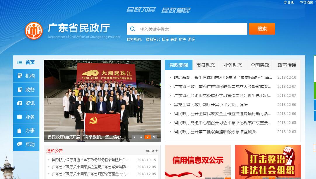 根据《中共广东省委、广东省人民政府关于印发〈广东省人民政府机构改革方案〉的通知》(粤发〔2009〕8号),设立广东省民政厅,为省人民政府组成部门。其主要职责:(一)贯彻执行国家和省有关民政工作的方针政策和法律法规,起草有关地方性法规、规章草案,拟订民政事业发展规划和相关的民政政策,并组织实施和监督检查。(二)负责退役士兵、复员干部和军队移交地方管理的离退休干部、退休士官和军队无军籍退休退职职工的接收安置工作;按省人民政府授权,负责烈士审批、褒扬工作;组织和指导拥军优属工作。(三)负责组织、协调城乡救灾工作,组织自然灾害救助应急体系建设,负责组织核查并统一发布灾情,管理、分配省级救灾款物并监督使用,组织、指导救灾捐赠。(四)负责城乡居民最低生活保障、医疗救助、临时救助、流浪乞讨及生活无着人员救助工作,健全城乡社会救助体系。(五)负责全省乡(镇)以上行政区域的设立、撤销、调整、更名、界线变更以及政府驻地迁移的审核报批工作,负责省际行政区域界线的勘定和管理,负责边界争议的调处事务,组织编制地名规划,负责地名命名、更名、销名审核工作,规范地名标志设置和管理工作。(六)提出加强和改进城乡基层政权建设的建议,推动基层民主政治建设,指导实施城乡基层群众自治组织建设和城乡社区建设,指导城乡社区服务体系建设。(七)负责社会福利机构的监督管理,促进慈善事业发展,组织指导社会捐助工作,指导老年人、孤儿和残疾人等特殊群体权益保障工作。(八)负责推进婚俗和殡葬改革,负责收养登记管理工作,指导婚姻、殡葬、收养、救助服务机构管理工作。(九)承担依法对社会团体、基金会、民办非企业单位进行登记管理和监察的责任。(十)会同有关部门按规定拟订社会工作发展规划、政策和职业规范,推进社会工作人才队伍建设和相关志愿者队伍建设。(十一)负责管理福利彩票销售工作,负责管理、使用、发放福利资金和民政事业费。(十二)承办省人民政府和民政部交办的其他事项。
