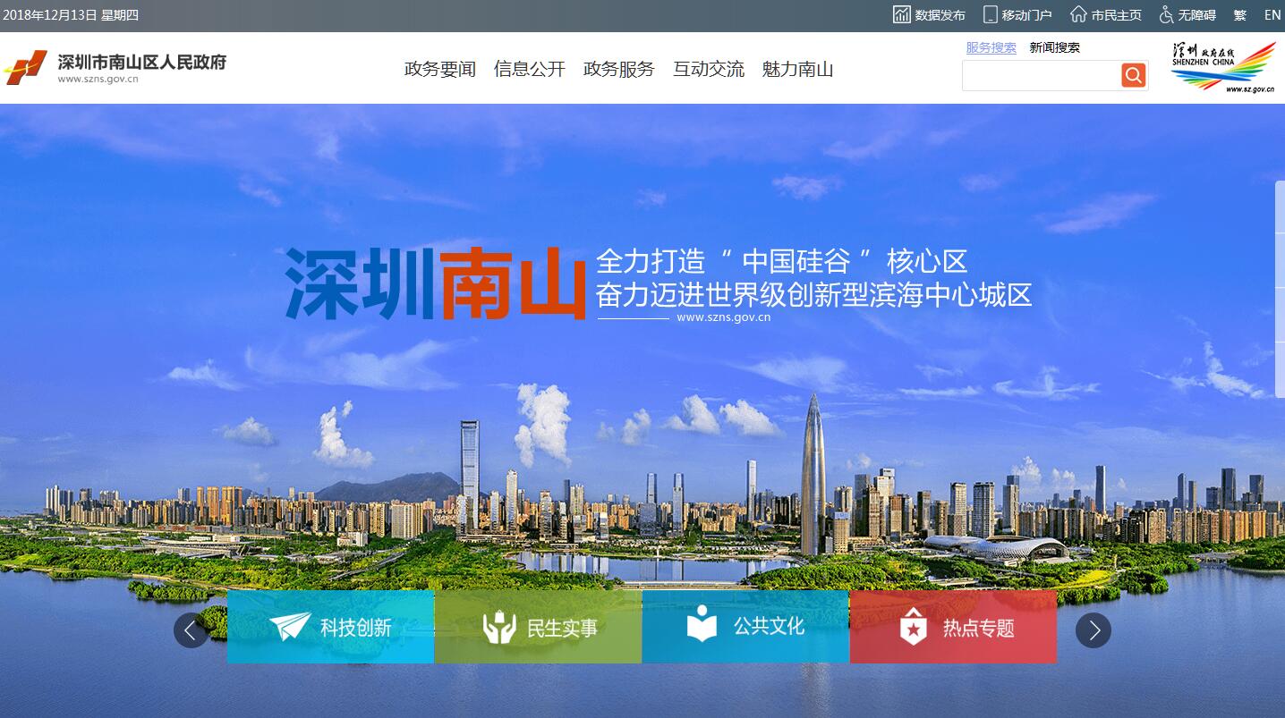 南山区隶属于广东省深圳市,位于深圳经济特区西部,介于北纬22°24′-22°39′,东经113°53′-114°1′之间,行政区域东起车公庙与福田区相邻,西至南头安乐村、赤尾村与宝安区毗连,北背羊台山与宝安区接壤,南临蛇口港、大铲岛和内伶仃岛与香港元朗相望,总面积182平方公里。南山区地处亚热带,滨临南海,属亚热带海洋性气候,四季温暖湿润,地势北高南低,平地、台地、山丘相间,由北向南逐级下降,主要山峰有羊台山、塘朗山、大南山等。截至2016年,南山区下辖8个街道。2015年,全区常住人口129.12万人。2015年,全区实现地区生产总值3714.57亿元,人均生产总值306091元。南山区是深圳的科研、教育、体育中心,是深圳大学、深圳大学城、深圳市高新技术产业园、深圳湾体育中心所在地。南山区旅游资源丰富,有深圳华侨城、世界之窗、欢乐谷、锦绣中华,海上世界、新安古城、青青世界、深圳野生动物园、南头古城等主题公园和著名景点。2016年5月,深圳市南山区成为国务院首批双创区域示范基地。2017年12月,当选中国工业百强区和中小企业知识产权战略推进工程试点城市。2018年9月,《2018年中国百强区发展白皮书》在京发布,白皮书以高质量发展为导向,综合评析了全国968个地级市市辖区发展情况,并以统计数据为依据,量化评选出2018年中国百强区,其中南山区位列第一名。2018年11月,入选2018年工业百强区。