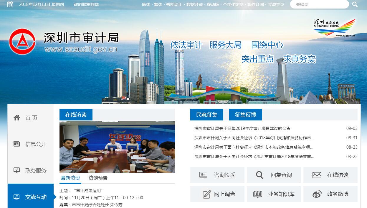 深圳市审计局为市政府主管全市审计工作的工作部门,实行市政府和省审计厅双重领导体制。其主要职责:(一)贯彻执行国家、省、市有关审计工作的法律、法规和政策;起草有关地方性法规、规章和政策,经批准后组织实施;制定并组织实施相关审计工作规划与年度计划,并对直接审计、调查和核查的事项依法进行审计评价。(二)向市政府、上级审计机关报告或向市有关部门、区政府通报审计情况和审计结果,提出制定和完善有关法规政策的建议。(三)直接审计下列事项,出具审计报告,在法定职权范围内做出审计决定或向有关主管部门提出处理处罚的建议:1.市本级预算执行情况和其他财政收支。2.区政府预算的执行情况和决算以及其他财政收支情况。3.市直各部门、事业单位及下属单位的财务收支及其绩效情况。4.市属金融机构的资产、负债和损益状况。5.市属资产经营公司、授权经营企业集团和国有企业资产、负债和损益。6.市属国有资产控股或占主导地位的中外合资企业、合作企业、股份制企业、境外企业中的国有资产部分的盈亏和国有资产保值增值。7.市国家建设项目预算执行情况和决算的真实、合法、效益。8.市政府投资项目的全过程跟踪审计。9.市政府部门管理的和受市政府及其部门委托由社会团体管理的社会保障资金和其他社会公共资金。10.依照上级审计机关授权审计国家、省驻深单位和中央、省直属企事业单位的财务收支,以及国际组织、国际金融机构和外国政府贷款、援助、赠款项目和项目执行单位的财务收支。11.法律、法规规定应由市审计局进行的其他审计事项。(四)向市政府提交市本级预算执行和其他财政收支情况的审计结果报告;受市政府委托向市人大常委会提出市本级预算执行情况和其他财政收支的审计工作报告、年度绩效审计工作报告和审计工作报告反映问题整改情况的报告;依法向社会公布审计结果。(五)组织实施为贯彻执行国家财经政策和宏观调控措施情况的行业审计、专项审计和审计调查。(六)组织实施对党政领导干部和国有企业及国有控股企业领导人员的任期经济责任审计。(七)依法检查审计决定执行情况,督促纠正和处理审计发现的问题;依法办理被审计单位对审计决定提请行政复议、行政诉讼或市政府裁决中的有关事项。协助配合有关部门查处相关重大案件。(八)指导和监督全市内部审计工作和社区集体经济审计工作;核查社会审计机构对依法属于审计监督对象的单位出具的相关审计报告。(九)依法定权限领导下级审计机关;协助管理下级审计机关领导班子和协助任免负责人。(十)承办市政府及上级审计机关交办的其他事项。