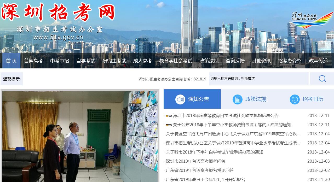 深圳市招生考试办公室是深圳市招生考试委员会、深圳市自学考试委员会的日常办事机构,是深圳市教育局参照公务员法管理的直属单位,主要负责全国普通高校招生统一考试、全国硕士研究生招生考试、高等教育自学考试、全国成人高校招生考试、广东省普通高中学业水平考试、深圳市初中毕业生学业考试、深圳市初二学业水平考试以及全国英语等级考试(PETS)、全国计算机等级考试(NCRE)、全国高等职业院校招收中等职业学校毕业生统一考试、全国中小学教师教育技术水平考试、全国中小学教师资格考试(笔试)、国家教育部考试中心组织的全国非学历证书考试等招生考试管理工作。根据深圳市机构编制委员会办公室和市教育局关于市招生考试办公室“三定”方案,深圳市招考办主要职能如下:一、贯彻执行国家和省、市有关教育招生考试工作的方针政策和法律法规,制定实施意见、改革方案,经批准后组织实施。二、负责本市高中阶段学校招生考试和本市初中学业水平考试的组织管理工作。协调、汇总、公布在本市招生的高中阶段学校的招生计划。负责本市高中阶段学校招生的录取管理工作。三、负责本市普通高考、成人高考、高中学业水平考试的组织管理工作。负责普通高考的报名、体检、建档、考试的组织管理工作。协助省招办做好普通高等学校、高等职业院校和成人高等学校的招生录取工作。四、承担本市高等教育自学考试的新生报名、报考、考务、考籍、毕业申请初审等组织管理工作。承担硕士研究生入学报名、考试工作。五、负责本市全国计算机等级考试、全国英语等级考试、全国中小学教师教育技术水平考试、全国中小学教师资格考试(笔试)、中职技能课程考试、非学历证书考试等教育考试的组织管理工作。六、负责本市各类教育考试及招生录取计算机网络管理系统的建设、软件开发、系统运行与维护工作。负责各类教育考试的数据管理和统计分析工作。承担本市教育考试及招生信息化建设的规划管理与指导工作。七、负责本市各类教育招生考试的考试安全和保密管理工作。负责调查处理招生和考试工作中发生的重大问题,维护考试的公平公正,以及考生和招生、考试工作人员的正当权益。八、开展本市各类教育招生考试的研究、宣传、咨询服务以及内外交流。九、负责本市教育统一考试定点考场的规划、建设、管理工作。十、负责本市各区招生考试机构、自学考试助学机构以及市属普通和成人本、专科学校、高中阶段学校招生考试工作的指导和统筹管理工作。十一、深入研究基础教育,协助推动基础教育改革,以及与之配套的考试招生制度改革。十二、负责市招生考试委员会的日常工作。十三、承办市委、市政府和上级部门交办的其它事项。为便于工作的衔接,深圳市招考办加挂“深圳市招生考试委员会办公室”、“深圳市高等教育自学考试办公室”牌子。深圳市招生考试办公室以服务社会、服务学校、服务考生和家长为宗旨,以为深圳的教育改革与发展,率先实现教育现代化为目标,将努力全面提高招考工作质量。