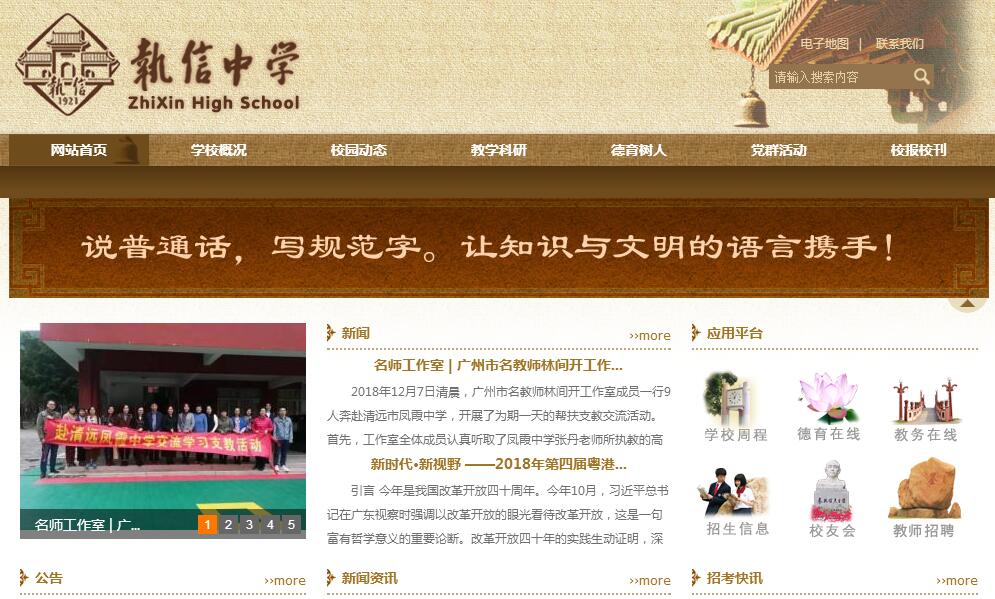 广州市执信中学是孙中山先生于1921年为纪念朱执信先生而亲手创办的一所纪念性学校,廖仲恺、胡汉民、孙科、蔡元培、林森、李大钊、戴季陶等人都是学校校董。广州市执信中学是广东省重点中学,国家级示范性普通高中。九十多年来,始终秉承“崇德瀹智”的校训,坚持“立德树人”的办学宗旨,致力培养“改造未来社会之人才”,培养了数以万计的优秀毕业生,杰出校友遍布世界。学校以“追寻完整的教育生活”为理念,建设多样化课程,满足学生全面发展、多元发展、特长发展的需求。与中山大学、华南理工大学等十多所高校、医院和科研机构合作,采用“导师 + 研究生 + 本科生 + 高中生”模式开展课程学习,探索培养拔尖创新型人才的新途径。教学质量高位稳定,名列广州市前茅。90%以上的高中毕业生进入国内重点大学,每年有近百名优秀毕业生被哈佛、斯坦福、康奈尔、巴黎政治学院、香港大学、香港科技大学等世界著名学府录取。学生社团蓬勃发展,共有38个社团,其中模拟联合国社团辐射华南、走向全国、走向世界;学校的艺术教育、体育教育、科技教育成绩显著,学校艺术团、运动队多次在全国乃至世界舞台上取得优异成绩,学生在国际、全国、省市青少年科技创新大赛中屡获大奖。1998年,李岚清副总理到执信中学视察时评价说“这所学校素质教育办得不错”,并题词“持之以恒”。2010年,教育部陈小娅副部长视察执信中学,对学校的课程改革给予了高度的评价。2011年,国务院副总理汪洋(时任广东省委书记)给执信中学90周年校庆发来贺信,称赞“执信中学是一所有着光荣传统和辉煌业绩的名校”。学校先后获得“全国现代教育技术实验学校”、“全国创建绿色学校先进单位”、“全国艺术教育先进单位”、“广东省文明单位”、“广东省先进集体”、“广东省德育示范校”、“广东省科学教育特色学校” “广东省依法治校示范学校”、“广东省体育特色学校”等荣誉称号,成为广东省教育战线的一面旗帜,在国内外也享有较高的声誉。