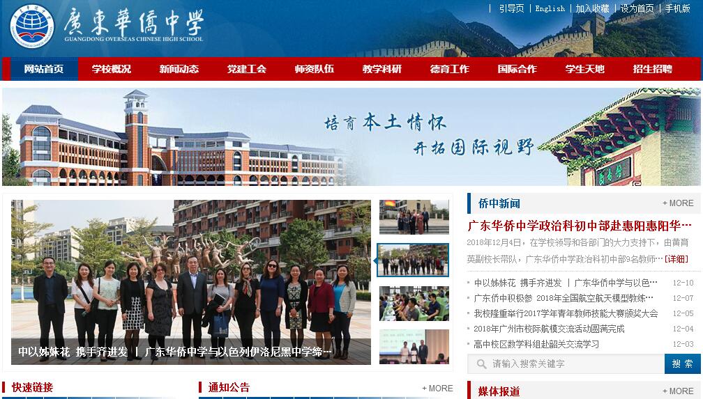 广东华侨中学历史悠久,前身为四邑华侨中学,于1930年创建,后因战乱停办。1946年由台山、新会、开平、恩平等地爱国华侨集资复办,选址在当年的“台山会馆”(今广州起义路158号广东华侨中学图书馆)。1950年政府接管后更名为“广东华侨中学”。学校是广东省国家级示范性普通高中、广东省普通高中教学水平优秀学校、广东省中华文化传承基地、广州市基础教育国际交流与合作基地、广州市特色学校、广州市教育局直属唯一“侨”字号完全中学,也是全省唯一以“广东”冠名的华侨中学。广东华侨中学目前拥有初中和高中两个校区。初中校区地处市中心腹地广州起义路158号,临近地铁1、2号线公园前站,地理位置优越。高中校区位于白云区金沙洲善贤路1号,毗邻地铁六号线首发站浔峰岗站。金沙洲校区在规划布局上借鉴了广东传统岭南书院的空间格局,将各组建筑与风雨连廊、广场连为一体,围合成一个个院落空间,组合出各具特色的教学区、运动区和生活区,在步移景换中体味建筑与环境的对话、感受时间的流动和四季的更替。其建筑风格表达出融合西方的“雅”和中国的“和”的诗化意境,是一座具有传统历史文化魅力的现代岭南名校。广东华侨中学现有教职工213人,专任教师近200人,其中高、中级教师142人,博士、硕士研究生学历教师94人,高级教师和研究生学历教师占专任教师的67%。有国家、省、市“名校长”培养对象,高级、中级教师评委会入库评委,市教研会特约教研员、理事等30多人。40多人获南粤优秀教师、南粤优秀班主任、广州市优秀教师等优秀称号。广东华侨中学以“培育本土情怀,开拓国际视野”引领学校内涵发展,将优秀的学校文化转化为学校内在发展的驱动力,大大提升了学校办学品位和师生生命质量。学校开展无线电、管乐、语文、英语、电脑、跆拳道、美术、机器人、健美操等特色教学。丰富多彩的校园文化活动的成为我校一大亮点,也为学生创造满足其个性发展的条件,提供施展才能的舞台。广东华侨中学学生社团活动多姿多彩,学校目前有微电影社、动漫社、机器人社、街舞社、篮球队、模联、魔术社英语话剧设等学生社团26个,形成全面发展、体艺见长的多元办学格局。广东华侨中学坚持继承与创新相结合,积极开拓名校发展新优势,培植优质教育新平台。在学校管理、科技创新、体育艺术、升学高考中捷报频传、亮点纷呈、硕果累累。近3年,学生参加各级各类竞赛获奖400多项。姚捷、金仙真、范德富、侯孋玲等一大批同学被香港大学、清华大学、南京大学、美国印第安纳大学等国内外名牌大学录取。广东华侨中学主动适应基础教育国际化趋势,以国际化办学理念为先导,开展全方位、多层次的国际交流活动,先后与美国、加拿大、英国、西班牙、印尼、巴西、韩国、澳大利亚、香港、澳门、台湾等国家和地区开展合作交流。广东华侨中学在积极创建“中”“侨”“外”文化汇集的国际化教育基地过程中迎来新的发展机遇。