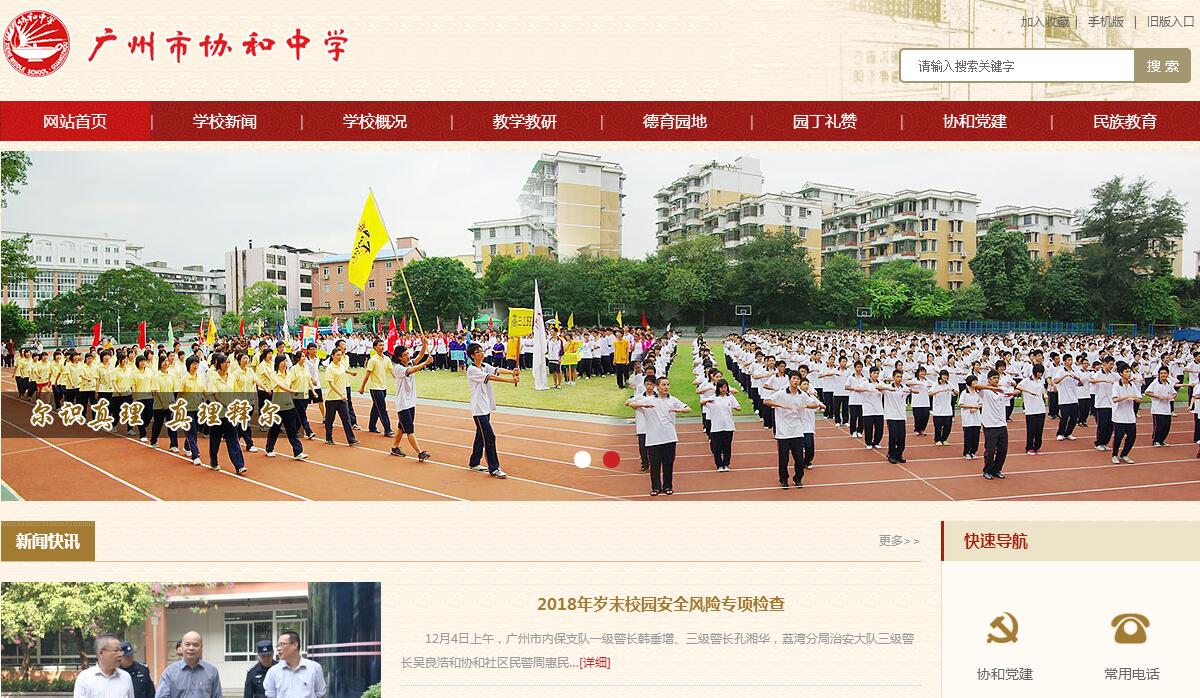 广州市协和中学是广东省国家级示范性普通高中,广东省一级学校 ,广州市教育局直属重点中学。广州市协和中学源自创办于1911年的私立协和女子中学和创办于1921年的市立师范学校。办学近百年来,协和培养出了林秉南、黄翠芬、李绍珍等院士和关山月、廖冰兄、欧阳山、潘鹤、夏雨、罗天婵、卢有光、朱哲琴等著名艺术家、文学家以及一大批优秀教师和各行各业的专家、学者;广东地区400余名中小学在职校长都是“协和人”(南方日报,2011)。学校还是国际生态学校、全国环境教育示范学校、中华百年名校、国家曲棍球奥林匹克后备人才基地学校、中国轮滑运动示范学校、广东省中小学心理健康教育示范学校、广东省现代教育技术实验学校、广东省青少年科学教育特色学校、广东省绿色学校、广东省节能先进单位、全省教育系统创先争优先进基层党组织、广州市高中新课程实验样本学校。师资雄厚 学校现有教职员工254人,其中专任教师201人。专任教师中有广东省特级教师2人、高级教师78人,博士、硕士研究生学历85人,国家、省、市优秀教师40余人,学科评委会专家50余人。成绩显著 2001年从五年大专师范学校转办普通高中后,学校高考成绩显著,位于同类学校前列,每年均超额完成广州市教育局预测目标。2005年培养出广东省高考英语单科状元陈锦莹,2010年尚英南同学以优异成绩被北京大学录取,2012年张嘉嘉以全省文科第44名的成绩被中国人民大学录取,至今已连续八年获得广州市普通高中毕业班工作一等奖。轮滑球、曲棍球特色明显,已为国家培养了二级以上运动员110多名。2010年学校圆满承办了全国单排轮滑球锦标赛,并获得成年女子组冠军等7个全国荣誉。2011、2012年学校轮滑球男、女队分别代表国家队出征世界轮滑球锦标赛,分别获得世界第八名、第六名暨亚洲第一名的好成绩。条件优越 学校地处广州市区中心地带,交通便利,30多路公交车途经,地铁五号线西村站直达学校。学校占地面积七万平方米,校园古树参天,园艺精美,是全省乃至全国最富特色的园林式学校。学校有1500多个床位,可以满足学生的住宿要求。