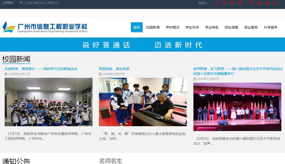 广州市信息工程职业学校是广州市教育局直属单位,公办国家级重点中等职业学校、广东省示范性中等职业学校,有50多年的办学历史。学校被广州市政府定位为广州地区信息技术产业的中高级技能人才培训基地,重点建设计算机应用技术、电子技术、通信技术等信息技术类专业。2006年经省教育厅批准增挂“广州市信息工程高级职业技术学校”牌子,开展高级技能人才培养。学校是广州市中等职业教育信息技术专业指导委员会主任单位,2008年起连续7年被省评为广东省中等职业教育竞争力十强单位。广州市人社局在广州市大专、中专院校中唯一设立的无线电调试、移动通信专业国家职业技能鉴定所设在我校。三星电子、中兴通讯、国光电器、金禧信息、上海合胜科技、广汽荻原等多家知名企业以及广东动漫游戏基地、蓝色快车服务站(纳入IBM、联想服务体系)、广东省电子学会电子信息工程师培训基地等与我校紧密合作,共同培养中高级技能人才。每年均有超过90%的毕业生,通过“三二分段”中高职衔接、高职院校自主招生、国家开放大学(电大)、普通高考、成人高考等方式,进入大专院校继续深造。2014年,加拿大魁北克省蒙特利尔英语教育局与我校合作,推出集留学移民、海外就业、获加拿大身份为一体的教学班,重点培养适应国际化发展及需求的高技能型实用人才。学校占地面积155亩,有天河、荔湾、同和、黄石四个校区其中,黄石校区为国家开放大学(电大)校区。各类专业实验实训设备先进、齐备,目前共有实训室103个,多媒体教室118个,设备资产总额5000多万。学校现有专业教师255人,均达到本科以上学历,中、高级职称超过70%,“双师型”教师占专业课教师的87%;在校学生达6000多人。