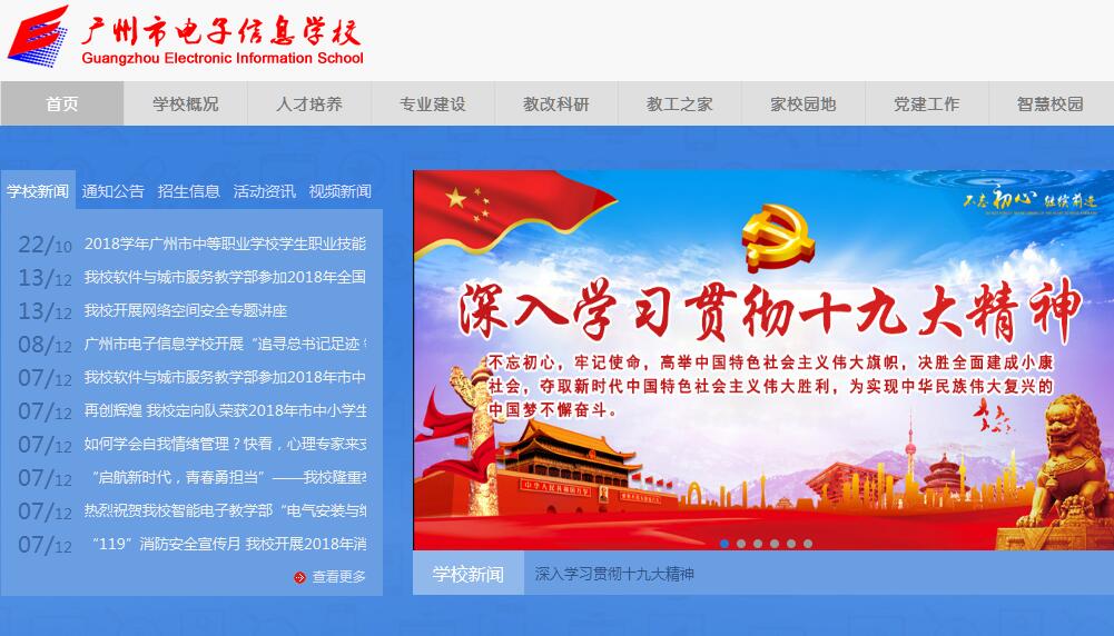 广州市电子信息学校(原名广州市电子职业高级中学)创办于1980年,是广州市第一所国家级重点职业高中。学校遵循"守诚、精技、励学、笃行"校训,全面实施素质教育,是一所内涵丰富、特色鲜明的电子信息类现代化中等职业学校。办学理念突显品牌名校的四大特色。学校积极为学生搭建掌握高新技术的平台,专业设置高端前沿。物联网技术应用、卫星定位技术、车联网技术应用、三维电子地图制作、全数字化的网络音响技术应用、智能安防监控技术、智能交通技术应用、动画游戏创造、三维动画制作、3D打印技术应用、影视作品拍摄与制作、微电影创作、移动智能系统应用、网络技术应用以及商务网站建设应用等,用无限创意引领学生的学习与实践,助推学生成长为技术技能型人才。学校积极为学生搭建展现青春风采的舞台,"艺术节"、"技能节"、"体育节"、"书香节"、"欢乐节"、"心理游园会"等品牌活动和形式多样的专业特色社团,创建寓教于乐、丰富精彩的校园生活,在综合教育领域为学生打造"人生出彩"的平台,铺设 "就业有优势,创业有基础,升学有希望,发展有基础"的成才之路。学校与众多高职院校建立长期合作关系,学生可按照入学专业的三二分段中高职衔接模式,转段升学到高职院校的相对应专业,还可通过高职院校自主招生、"3+证书"高职高考等形式升读高职,升学路径畅顺、就业质量高,学校历届毕业生升学就业率达到100%。学校积极为学生发展拓宽道路,自2011年起与新西兰国立北方理工学院合作,通过学分互认、课程对接、学术交流和共建特色教育班,输送学生到新西兰留学深造,实现电子信息类专业与国际接轨,提升办学质量,建设现代示范名校。