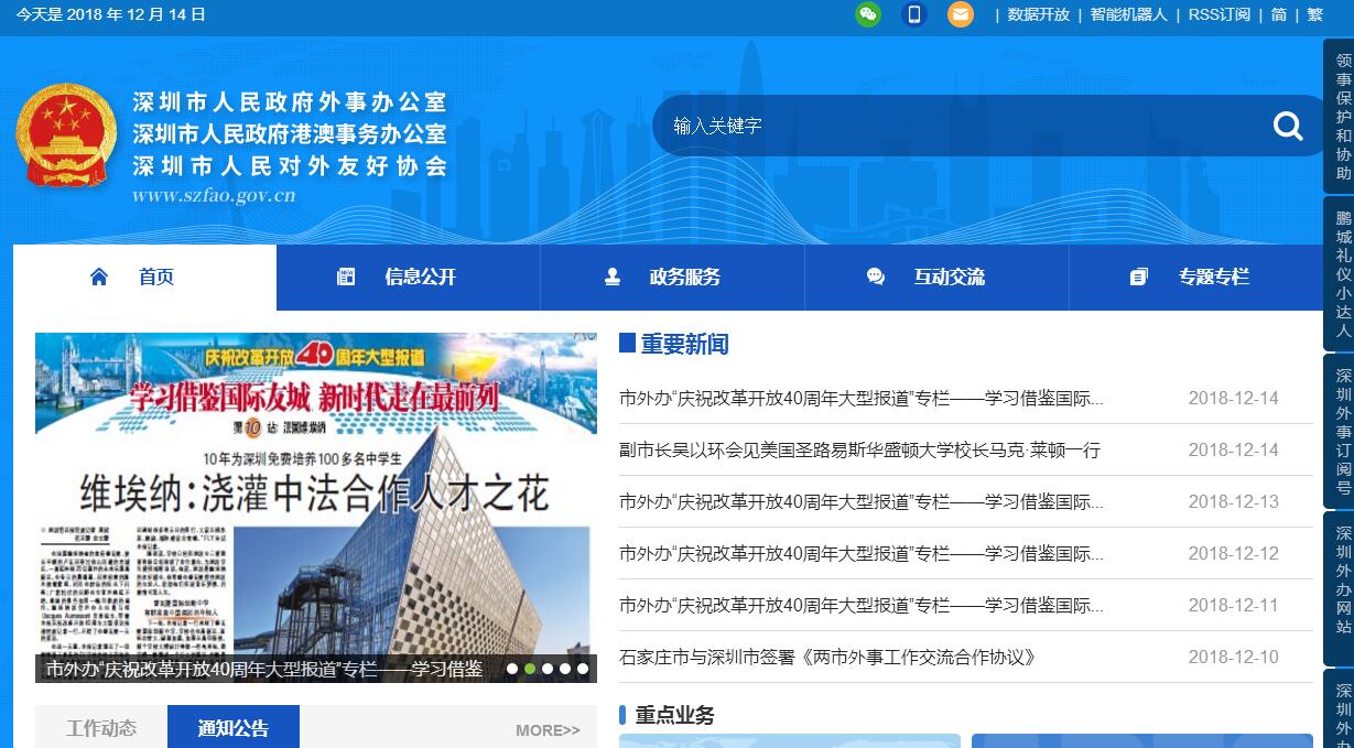 根据《中共深圳市委 深圳市人民政府关于印发<深圳市人民政府机构改革方案>的通知》(深发〔2009〕9号),设立深圳市人民政府外事办公室(简称市外办,挂市人民政府港澳事务办公室牌子),为市政府工作部门。其主要职责:(一)贯彻执行国家、省、市有关外事、港澳工作的法律、法规和政策,起草相关的地方性法规、规章草案,拟订相关政策,经批准后组织实施。(二)承担组织协调和处理重要外事、港澳工作和涉外活动事务的责任;承担市委外事(港澳事务)工作领导小组的日常工作。(三)负责组织接待访深的重要外宾、友好人士和来深公务活动的各国驻华使(领)馆官员;管理、组织在深举行的重大涉外活动;统筹安排市领导的外事及港澳事务活动。(四)负责管理来深采访的外国记者、外国驻深新闻机构和记者。(五)负责因公出访管理工作,承办因公出国赴港澳任务审核审批事项;承办市领导因公出访报批工作。(六)负责公务护照、出境证明、因公往来港澳通行证及签注的颁发和管理工作;为因公出国人员申办外国签证;审发外国人入境签证通知;为持外交、公务护照(含官员、特别护照)的外国人员延期和补发签证;代办领事认证。(七)指导、管理与外国驻华使馆及领事机构的交往事宜;协调处理各类涉外案(事)件;协调处理我市在境外人员和机构的领事保护工作;协调处理在深外国人管理重要事项。(八)负责深港澳政府间的联络及合作事务安排,官方、半官方交往及深港澳边境事务;完成中央港澳工作领导小组、国务院港澳办交办的港澳相关工作任务。(九)指导、管理与外国友好城市、友好省州(县)以及友好基层单位的交往工作;负责荣誉市民的授荣、管理和服务工作。(十)配合和协助有关部门做好对外和涉港澳宣传以及群众性外事教育工作;组织外事干部和涉外人员的教育培训。(十一)负责统筹推进全市国际化城市建设。(十二)承办市委、市政府和上级部门交办的其他事项。