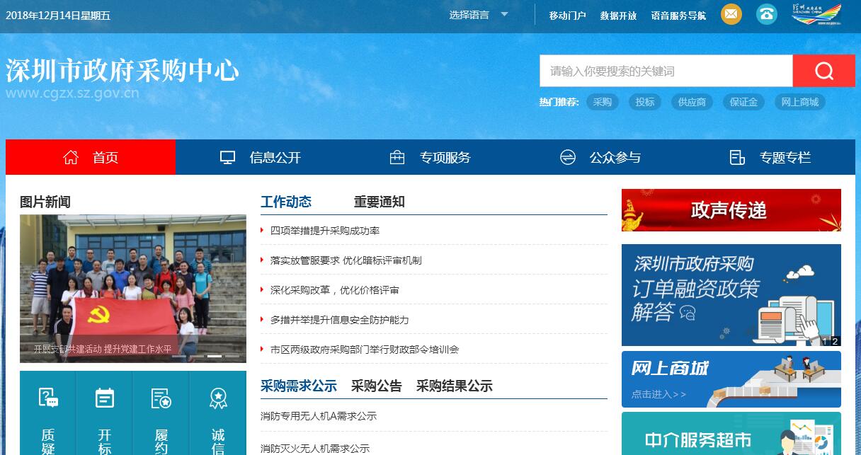 深圳市政府采购中心成立于2002年10月,是市政府直属副局级全额拨款事业单位,主要负责市本级集中采购和招标组织工作。根据《深圳经济特区政府采购条例》,作为市政府集中采购机构,中心的主要职责是:1、执行政府采购法律、法规以及有关规定,参与政府采购相关规定的制定,建立健全集中采购操作规程;2、按照规定组织实施集中采购目录内项目的采购并参与验收;3、按照规定组织实施保密、应急以及重大采购项目并参与验收;4、为政府集中采购平台提供场所、网络、信息和咨询服务;5、对进入政府集中采购平台的采购项目实施效益评估;6、对评审专家的评审过程和评审质量进行跟踪管理;7、负责受理并协调对政府采购项目的询问与质疑的答复,协助主管部门进行投诉处理工作;8、建立政府采购数据信息库,进行市场调查和价格分析;9、受主管部门委托,负责建立和管理全市统一的政府集中采购平台,对政府采购项目进行合同备案,建立和管理供应商库并对供应商的履约情况进行管理。10、法律、法规以及市政府规定的其他职责。中心现有编制60人。内设5个部,即综合部、货物采购部、工程和服务采购部、预选和合同管理部、信息和评审区管理部。其中综合部负责业务牵头、综合管理、纪检监察和党风廉政等工作;货物采购部负责集中采购范围内货物类项目的组织实施工作等工作;工程和服务采购部负责集中采购范围内工程类和服务类项目的组织实施等工作;预选和合同管理部负责预选采购项目的组织实施、电商采购、合同备案、履约评价和供应商库管理等工作;信息和评审区管理部负责中心政府采购平台的运行和维护服务、大厅和评审区的现场管理、中心业务的全流程监督、质疑、投诉和信访等工作。在市委、市政府的正确领导下,深圳市政府采购取得了很大的成就,政府采购总体框架已基本形成,信息化建设和信息公开透明度走在全国的前列,成为全国的一面旗帜。多年来,中心采购规模一直在全国大中城市中名列前茅,2002年至2017年,中心完成采购规模达668.84亿元,占市本级的80%以上,累计节约财政资金58.07亿元,年均节约3.87亿元。在采购范围上,做到应采尽采,实现了货物、工程和服务的全覆盖,集中度全国最高。中心探索和完善政府采购改革的成效,得到了原中纪委书记吴官正、原广东省委书记张德江等中央、省有关领导的充分肯定,受到了采购单位、供应商的广泛赞誉和国内同行、透明国际组织、媒体的高度评价。中心服务宗旨:依法采购、优质服务、规范操作、廉洁高效。