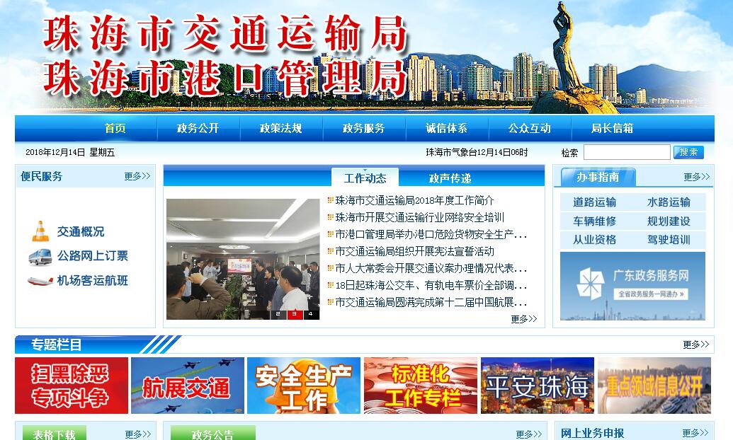 珠海市交通运输局主要职责:(一)贯彻执行国家、省、市有关交通运输行业的方针政策和法律法规,起草交通运输行业的地方性法规、规章,拟订有关政策措施,经批准后组织实施。(二)负责拟订全市交通运输发展战略和行业发展规划;组织编制城乡综合交通运输体系规划和交通运输专项规划、港口总体规划及港区、作业区控制性详细规划,经批准后组织实施;参与制定与交通运输行业相关的经济政策和调控措施;参与拟订物流业发展战略和规划;参与大型公共基础设施交通影响评价;承担交通基础设施建设项目的前期工作、后期评价工作及有关规划、收费公路立项的申请报批工作。(三)负责本市行政区域范围内交通运输行业管理,包括城市公共汽车、出租汽车、轨道交通(含地方铁路)、道路运输、水路运输、港口的行业管理,以及本市事权内的航空运输、铁路运输的行业监督管理工作。(四)承担道路运输、水路运输市场监管责任;组织制定道路、水路运输有关政策措施和运营规范并监督实施;指导城乡客运及有关设施规划和管理工作;负责全市公共交通运力投放,协调轨道交通运力投放、线网布局和站场管理工作;负责对城市公共汽车、出租汽车、轨道交通(含地方铁路)、道路运输、水路运输的服务质量和经营行为实施监督管理。负责协调民航业法规、规章的贯彻实施;负责制定地方民航业发展规划;负责全市民航业的统筹协调与监督工作;组织制定航空运输业发展政策并监督实施。(五)负责交通专项资金、交通规费管理工作;负责交通运输行业上级和本级政府政策性补贴资金、奖励资金的审核、拨付和使用的监督管理;负责部门预算编制和内部审计等相关管理工作;负责交通运输行业财政非税票据的管理和监督使用。(六)负责交通工程质量技术管理工作;组织审查交通基础设施建设工程项目和技改项目的可行性;参与交通科研项目的鉴定和重要研究成果的推广应用;研究解决交通工程设计和施工中的工程技术问题、工程质量事故问题,组织审定关键性的工程技术措施。(七)承担交通建设市场监督管理责任,组织协调交通运输工程建设、施工许可和工程质量、工程造价及安全监督工作,指导交通运输基础设施管理和维护工作。(八)负责指导交通运输行业应急管理工作,负责组织协调国家重点物资、紧急物资、特种物资以及军事、抢险救灾物资的运输工作;负责交通运输应急指挥、应急处置;负责国防交通战备的组织、协调管理,参与国防交通保障设施规划建设工作。(九)制定交通科技政策和交通信息化发展规划;组织重大交通科技项目攻关;承担交通信息化项目的规划建设、推广应用和监督管理;指导、监督交通运输行业技术标准和规范的实施;指导交通运输行业环境保护和节能减排工作;组织开展交通运输对外交流与合作工作。(十)负责协调交通运输行业安全生产工作;参与交通运输行业安全生产事故的调查处理工作;负责交通运输行业统计工作。(十一)负责汽车、摩托车维修业开业、变更业务的核准和经营资质管理;监督管理营运车辆技术等级评定、二级维护和综合性能检测。(十二)负责机动车驾驶培训机构的核准及驾驶员培训的监督管理;负责交通运输行业职业培训工作。(十三)负责行政检查、行政处罚、行政强制等交通运输综合行政执法工作;指导交通运输行业依法行政和普法教育工作;负责公路“三乱”的治理工作。(十四)指导公路养护和农村公路建设、管理工作。(十五)承办市人民政府和上级主管部门交办的其他事项。